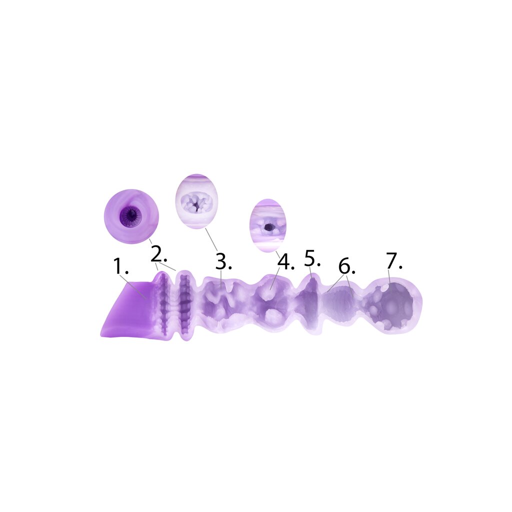 Her 14 cm tunnel is divided into seven sensations. You begin with a tight entrance lined with stimulating nubs. As you go deeper you encounter spiral textures inspired by dragon scales, soft chambers, tight paths and teasing bumps that build anticipation. In the final zone intricate scale like patterns guide you toward an intense and satisfying climax.
