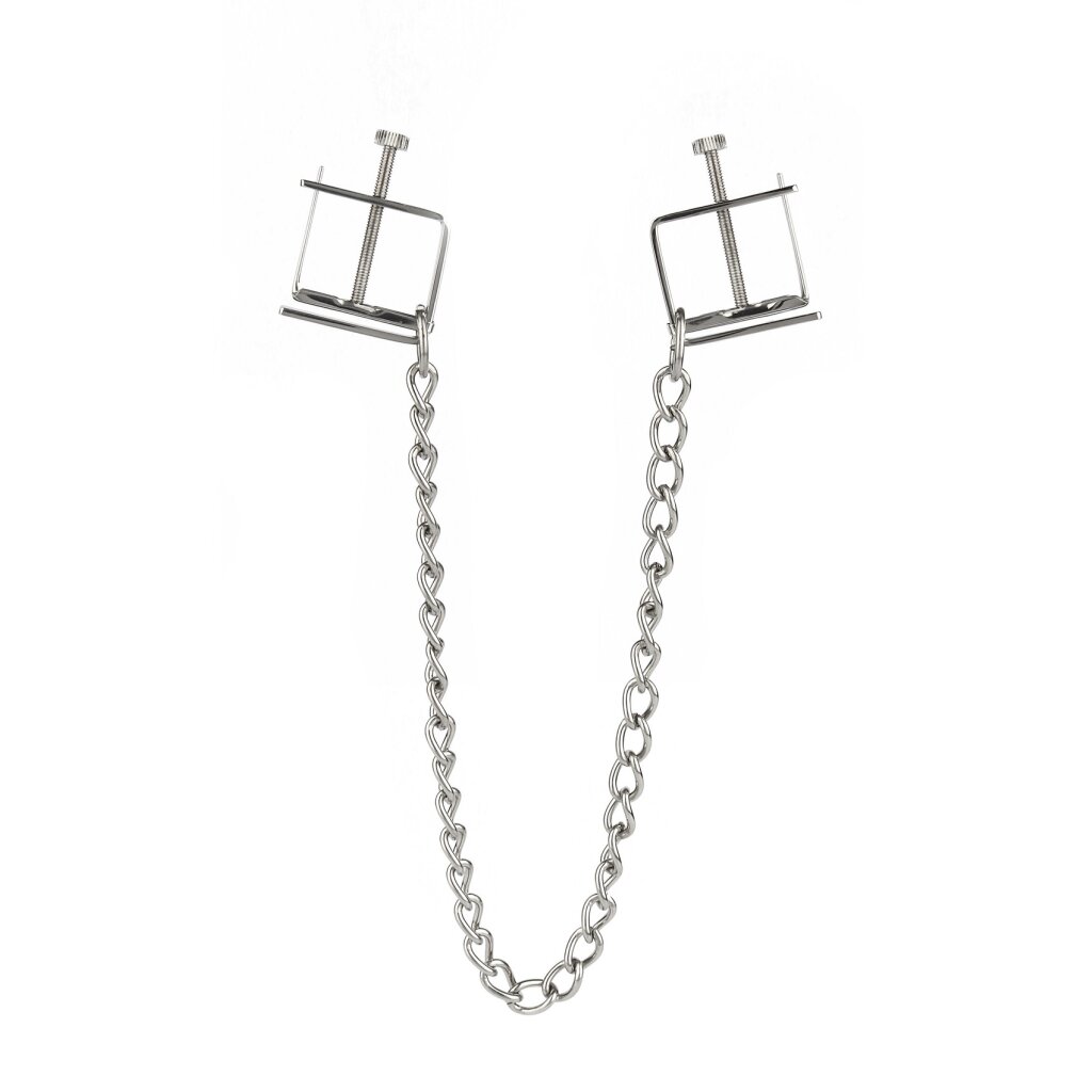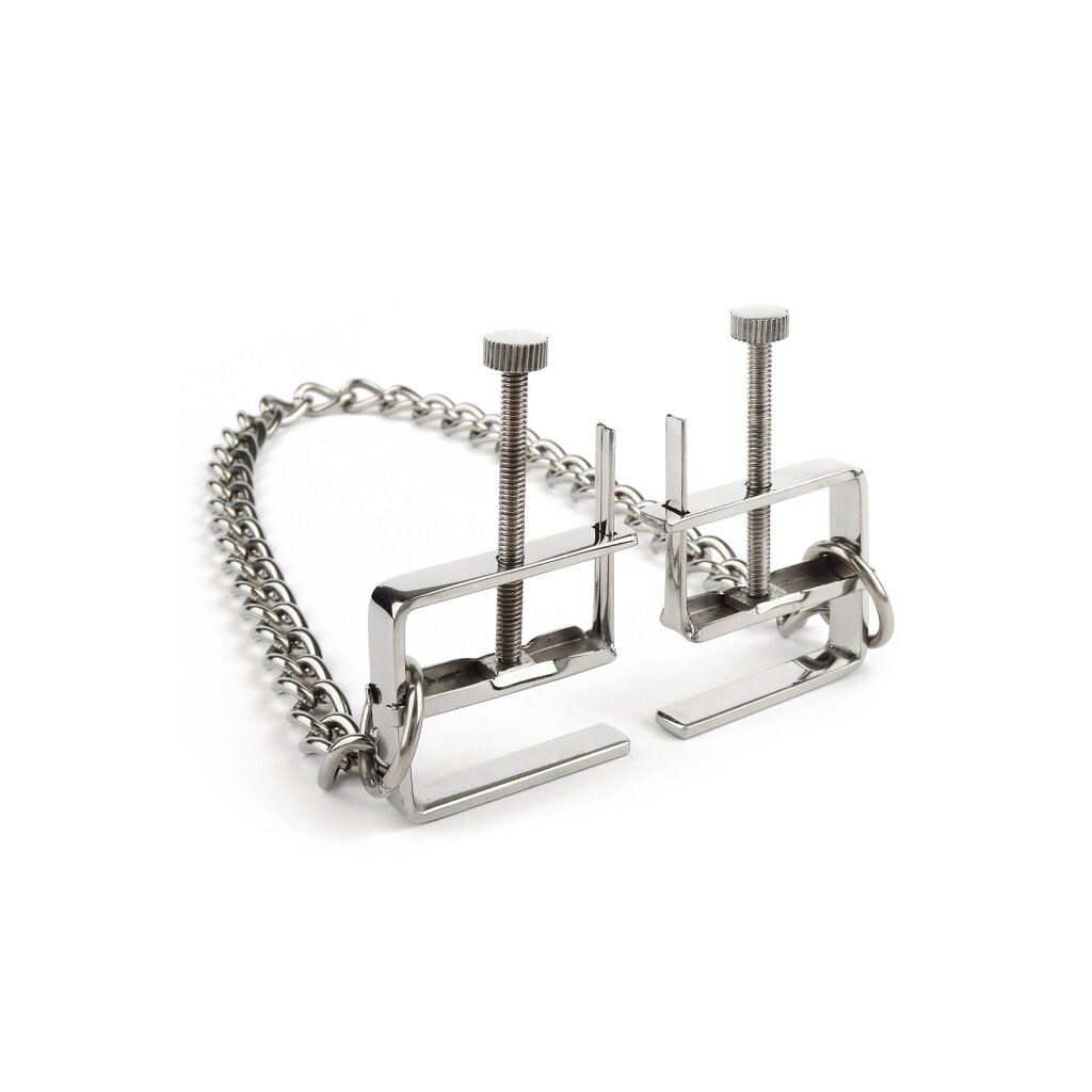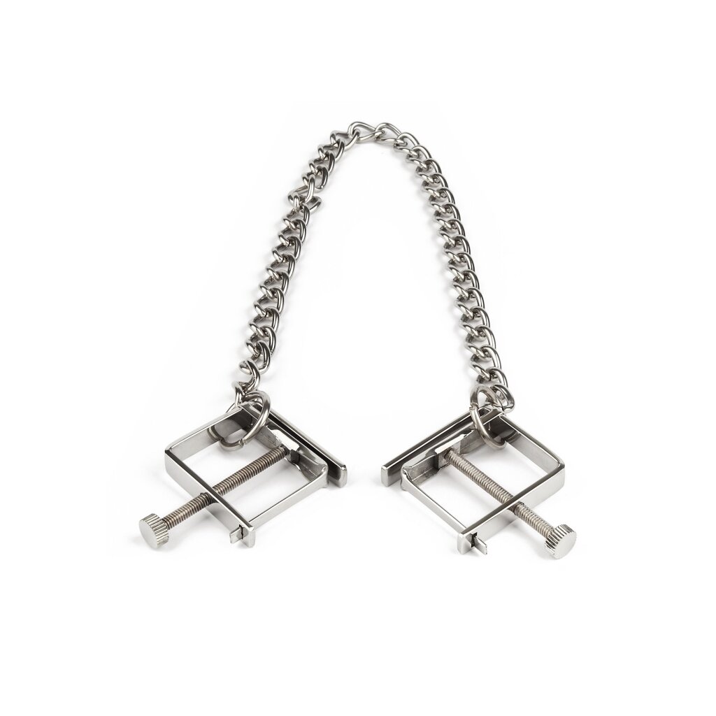 Les pinces à tétons avec chaîne Mr. Steel Press offrent une pression intense et réglable pour des jeux avancés avec les tétons. Fabriquées en acier inoxydable de haute qualité, ces pinces sont dotées d'un mécanisme à vis pour un contrôle précis de la compression. La chaîne de connexion ajoute du poids et permet une stimulation supplémentaire. La finition polie assure une prise sûre et confortable. Idéales pour ceux qui explorent les jeux d'endurance et de restriction, ces pinces augmentent la sensibilité et le plaisir. Surveillez toujours la circulation sanguine et retirez les pinces en cas d'inconfort. Nettoyez soigneusement avant et après utilisation.