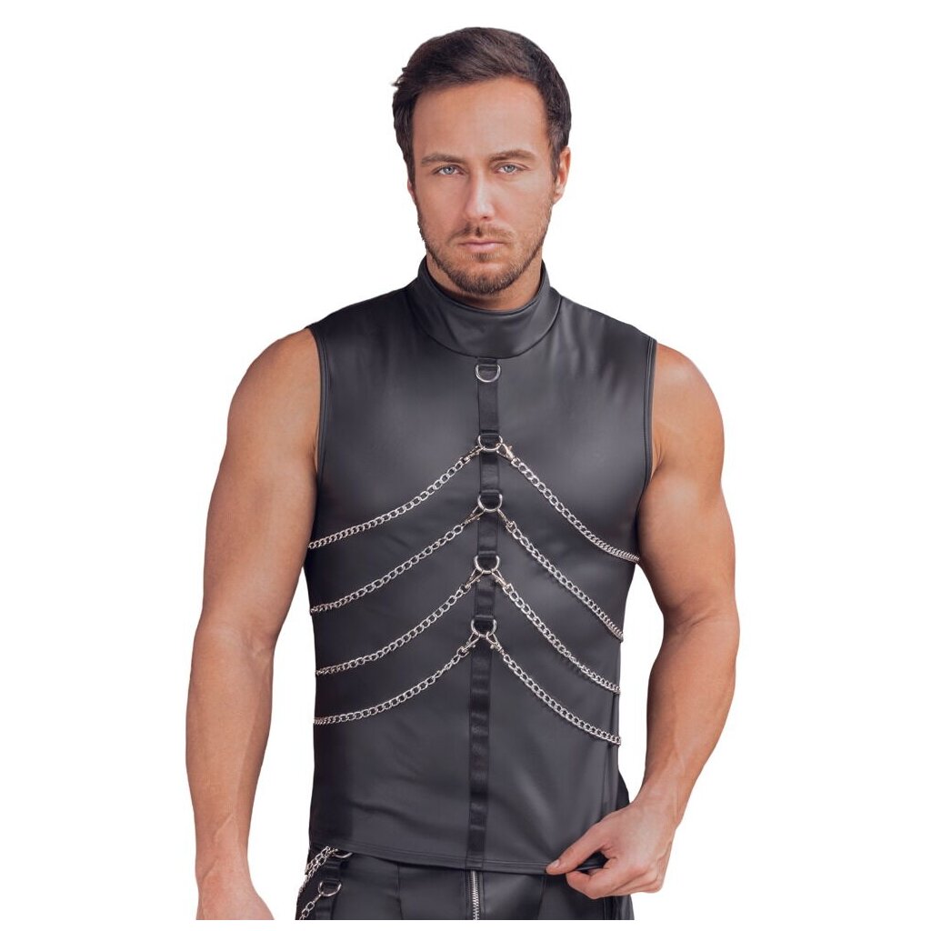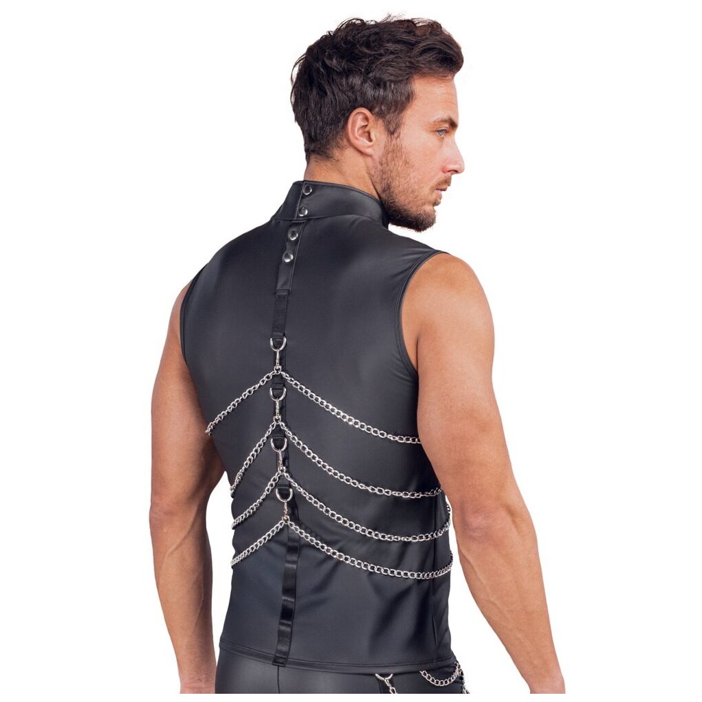 This sleeveless shirt blends matte black impact with striking silver details, wrapping the torso in a flexible, body-emphasizing fit. The stand-up collar with snap fastening adds a clean, masculine edge, while the front and back feature reinforced bondage rings that hold the four included carabiner chains.