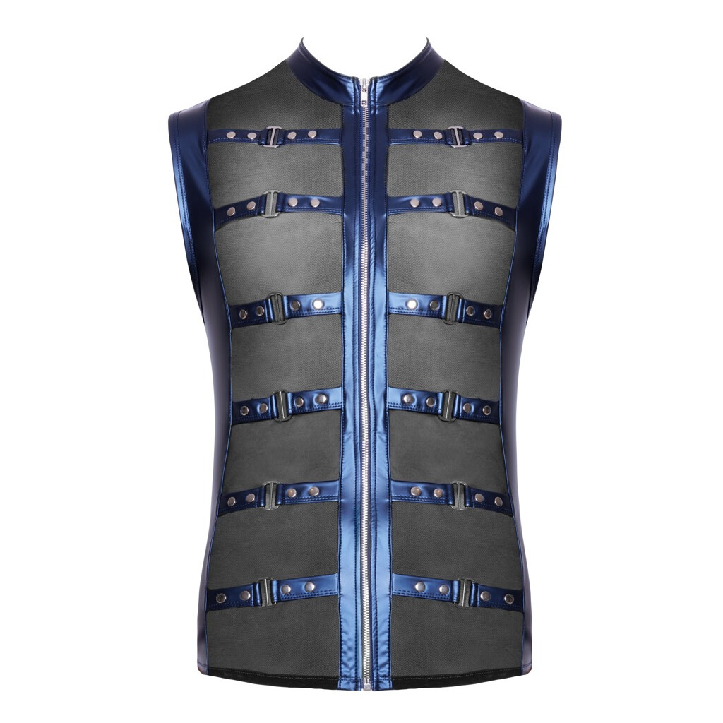 Sleeveless shirt from NEK in a close-fitting cut with a small stand-up collar and full-length front zipper. In a cool blue metallic matte look with studded straps at the front. Black transparent powernet inserts under the straps. Nice and stretchy for a comfortable fit.