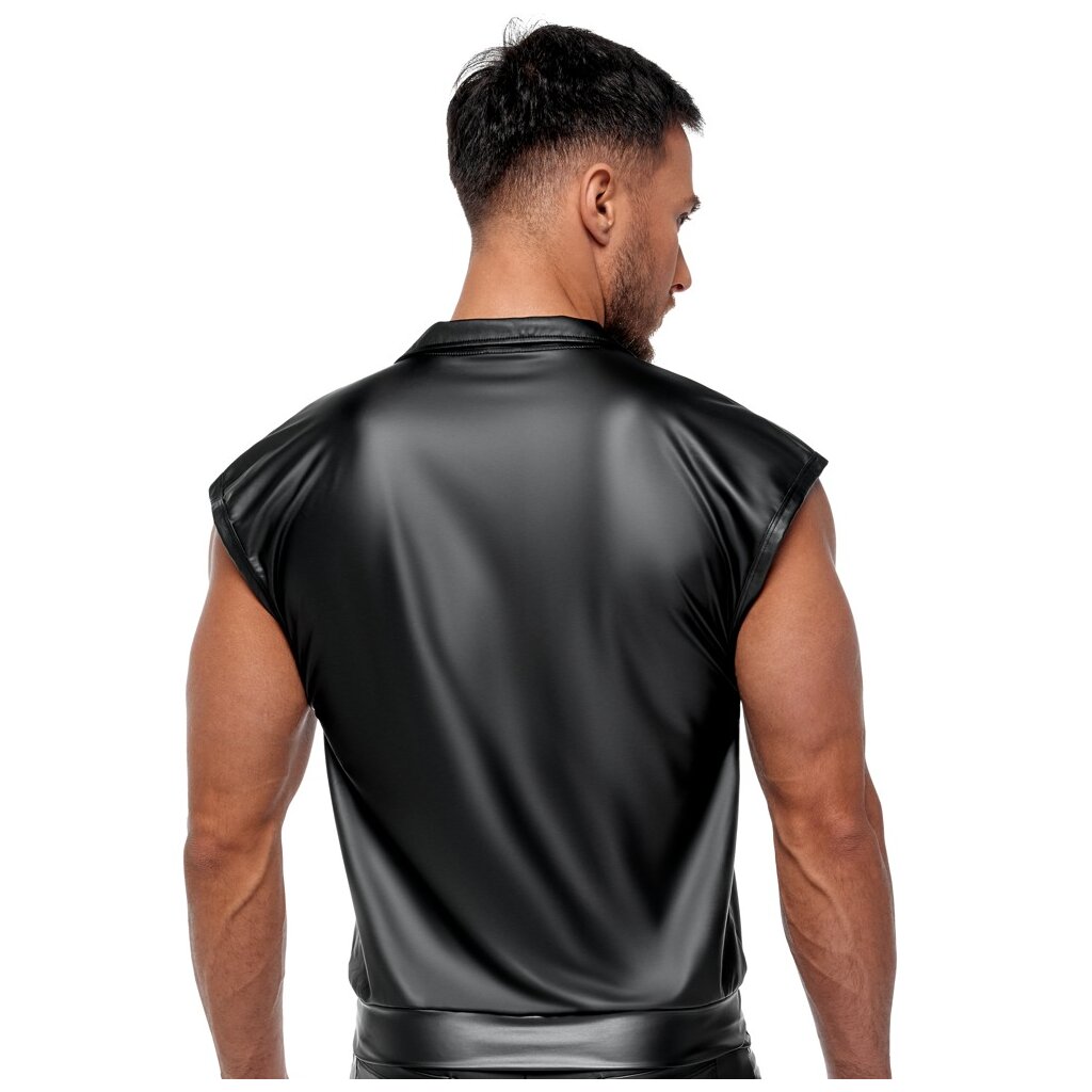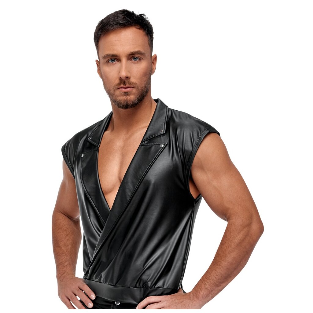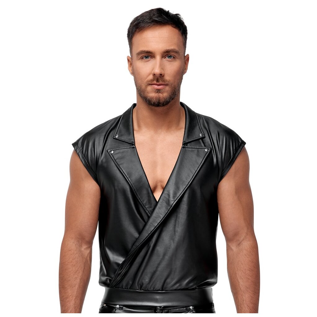 Loose casual shirt by NEK in a black noble matt look with casual overlapped sleeves and stretch waistband at the hem. Open overlapping front with long, studded lapel collar. Soft and stretchy all around for maximum comfort. Size M / Material composition: 90% polyester, 10% spandex