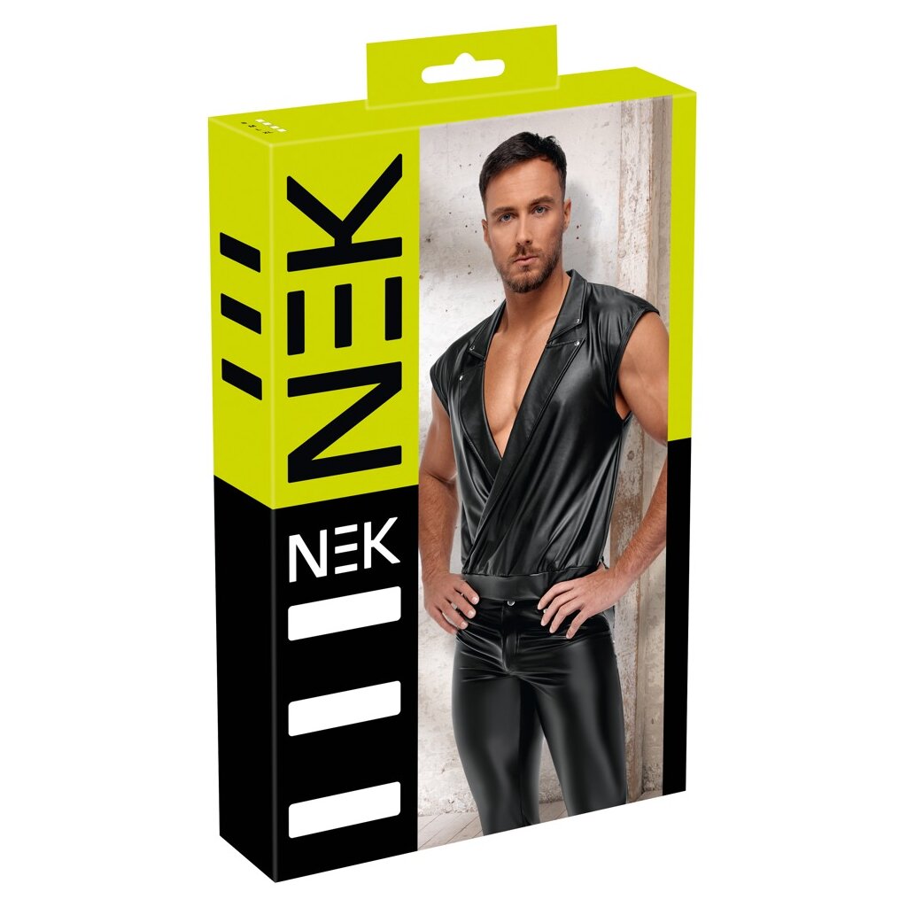 T-shirt décontracté de NEK dans un look noir mat et élégant avec des manches recoupées et une ceinture stretch à la base. Ouvert sur le devant avec un long col à revers clouté. Doux et élastique sur tout le pourtour pour un confort maximal. Taille S / Composition : 90% polyester, 10% élasthanne