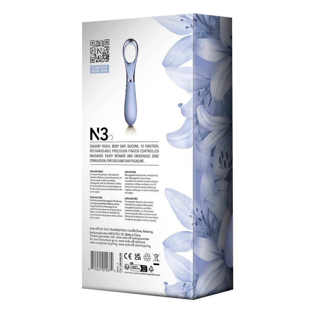 Le vibromasseur NIYA 3 de Rocks off, à la fois puissant et silencieux, séduit par sa dragonne ergonomique qui facilite son guidage et son utilisation. Le manche en silicone soyeux avec un embout arrondi et doucement texturé dorlote en particulier le clitoris et d'autres points sensibles. Il peut également être inséré par voie vaginale ou anale. Les 10 modes de vibration procurent un plaisir varié. Ce vibrateur à doigt sophistiqué est si polyvalent qu'il s'intègre parfaitement dans les jeux amoureux en solo ou en couple. Même dans le bain ou sous la douche, car il est étanche.