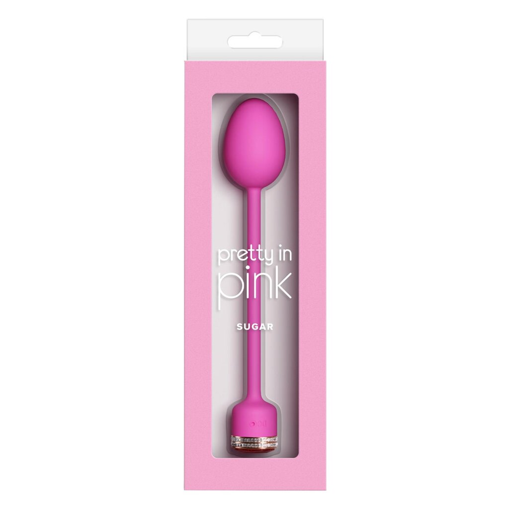 Der Sugar von Pretty in Pink ist ein elegantes, einführbares Vibro-Ei mit schlanker Form, flexiblem Rückholband und funkelnden Schmuckdetails.