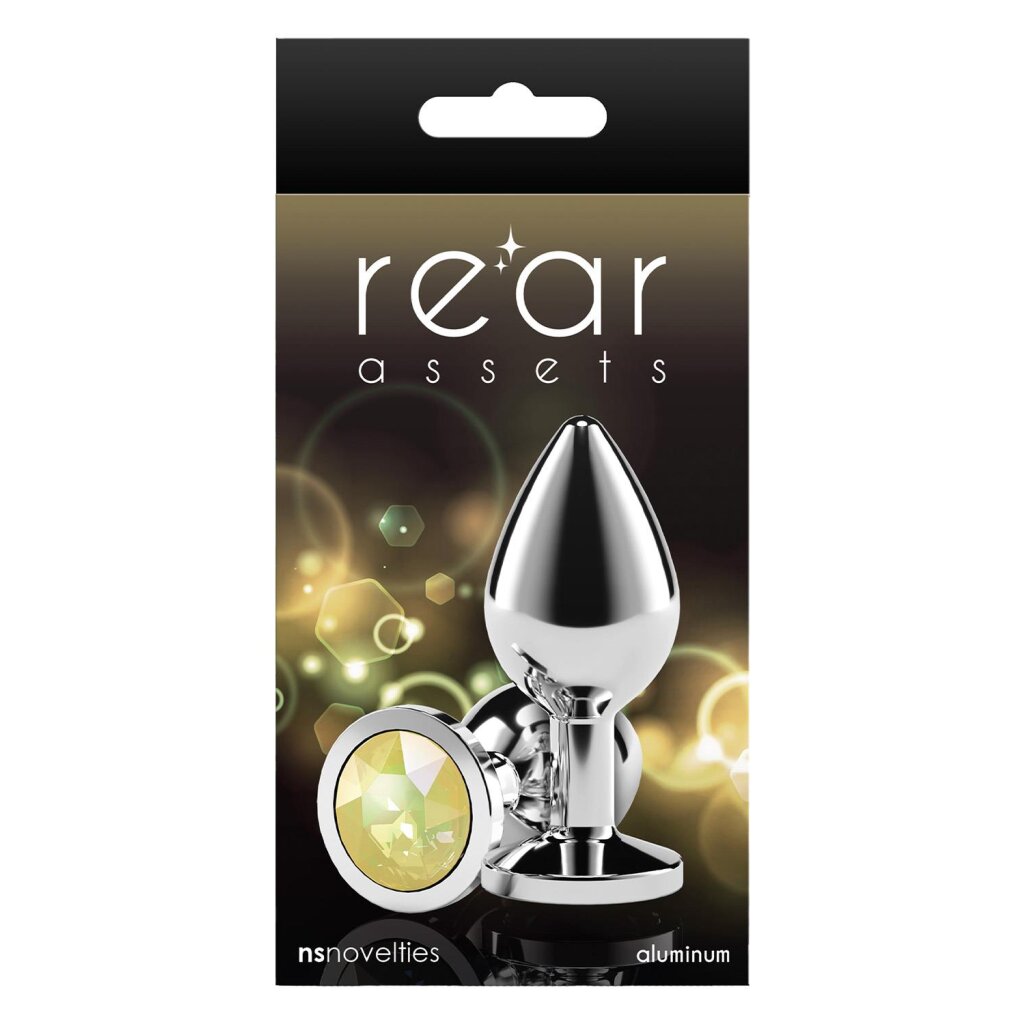 Le plug anal Rear Assets de NS Novelties en finition argent avec pierre jaune allie élégance visuelle et stimulation sensorielle. Sa surface lisse en aluminium chromé procure une sensation agréable et raffinée.