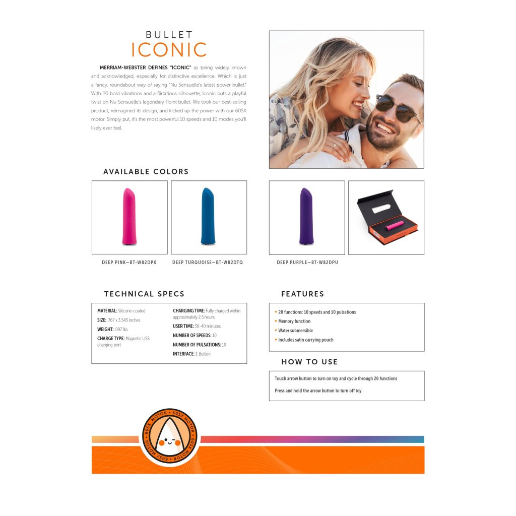 Mit 20 starken Vibrationen und einer koketten Form gibt der Iconic dem legendären Point Bullet von Nu Sensuelle eine spielerische Wendung. Wir haben unser meistverkauftes Produkt genommen, sein Design neu gestaltet und die Leistung mit unserem 60SX-Motor erhöht. Einfach ausgedrückt: 10 Gänge und 10 Modi - das ist die höchste Leistung.