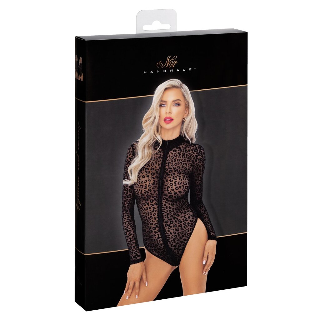 Feine Transparenz im Leo-Look! Langarm-Body von Noir komplett aus weichem elastischem Powernet mit feinem Samtflockprint im Leoparden-Look. Der praktisch-erotische 3-Wege-Reißverschluss verläuft vorne vom Stehkragen bis tief runter in den Schritt. Hohe Beinausschnitte setzen Po und Beine aufregend in Szene. Größe XL / Materialzusammensetzung: 90% Polyester, 10% Elasthan