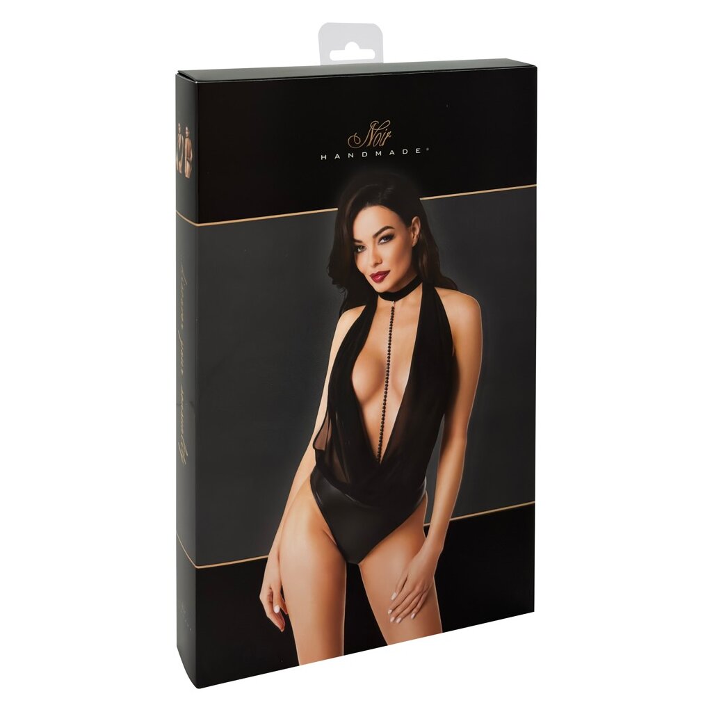Elegant black body by Noir with a transparent shimmering powernet top and panties in opaque power wetlook. The stretch waistband accentuates the plunging V-neckline with a detachable black pearl necklace. The neckholder is adjustable. Soft and stretchy all over for high wearing comfort.