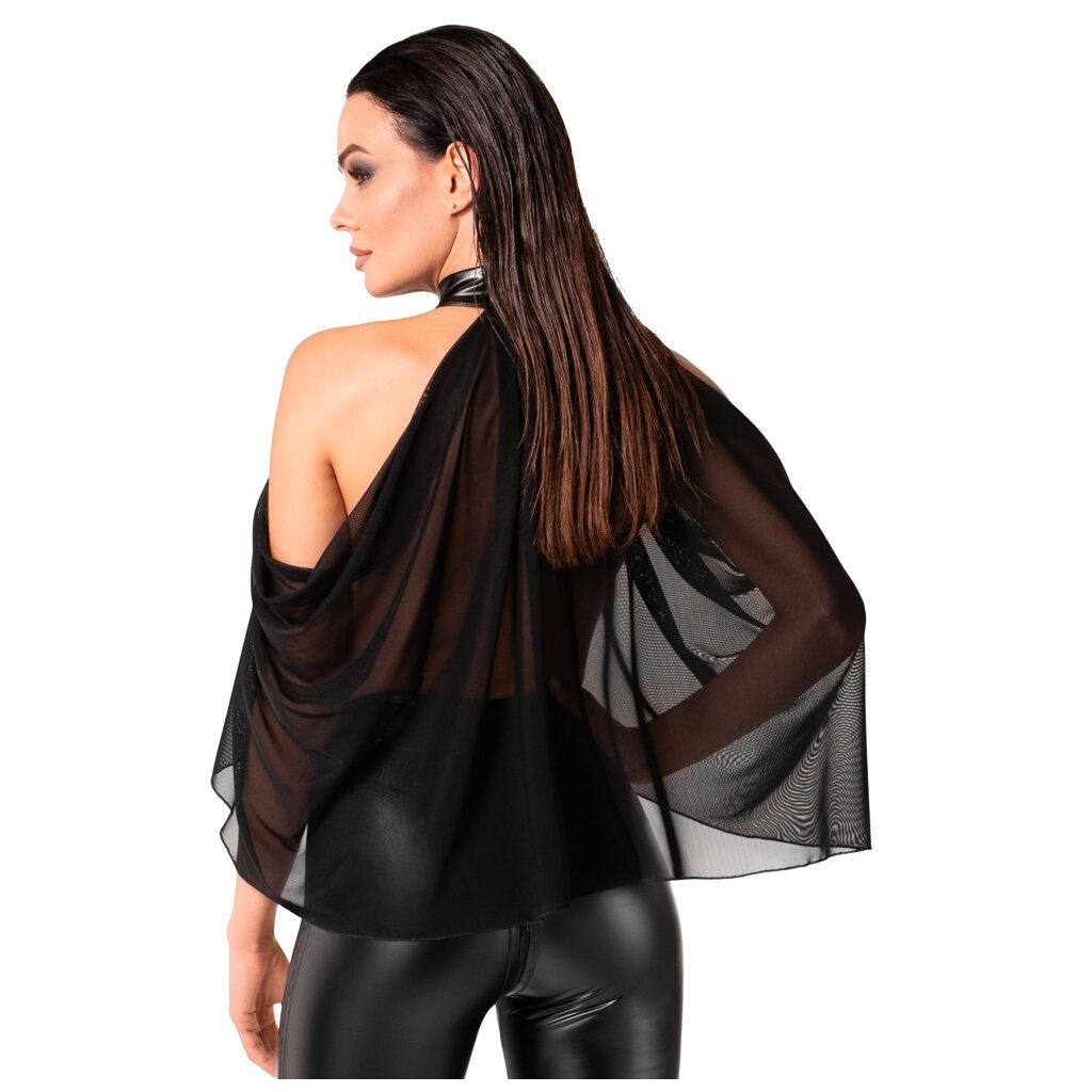 Luftiges und weit geschnittenes Oberteil von Noir, komplett aus feiner schwarzer Tüll-Transparenz.Schulterfreies Cape-Modell mit Träger im Power-Wet-Look, mit Druckknöpfen vorne. Asymmetrischer Schnitt: vorne kurz und offen, bedeckt die Arme und den Rücken.