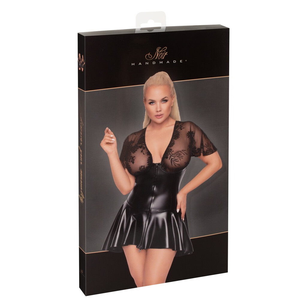 Robe courte de Noir Handmade Curves de style corsage avec jupe légèrement évasée. En noir noble powerwetlook avec un haut profondément fendu et des manches courtes et larges en tulle imprimé flocons de velours. Fermeture éclair sur toute la longueur du devant. Elastique tout autour et ajusté pour un confort maximal.