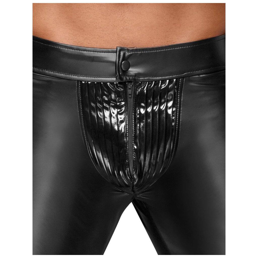 Tight-fitting pants by Noir in black powerwetlook - soft & elastic all around for high wearing comfort. Emphasizing style with pleated patent pouch and 2 patch back pockets in shiny patent look. With snap button and zipper closure. Belt loops in the waistband.