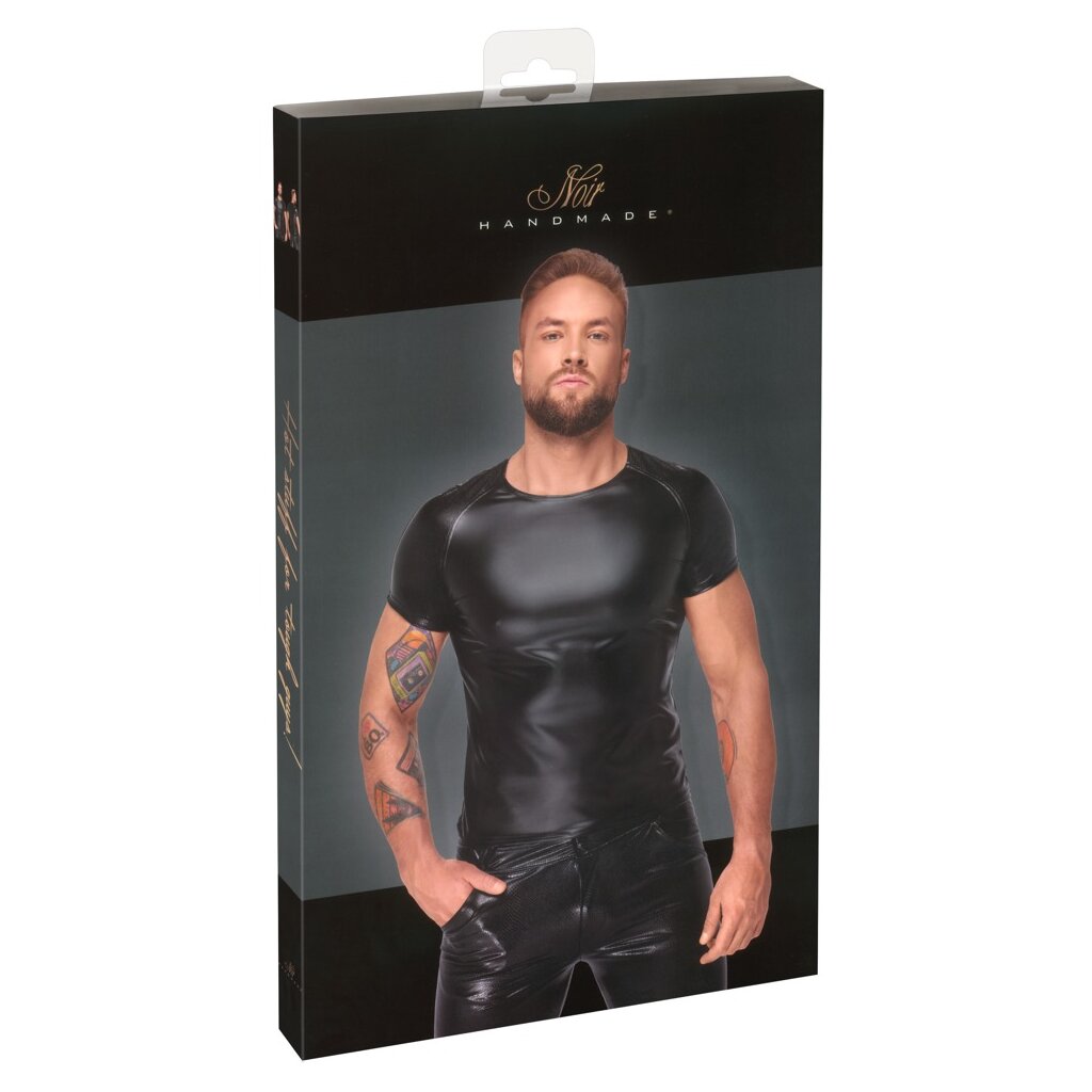 Betonendes Shirt von Noir im schwarzen matt glänzenden Powerwetlook. Kurze Ärmel und Schulterpartie in schillernder Schlangenhaut-Optik. Weich und elastisch für hautnahen Sitz und hohen Tragekomfort.