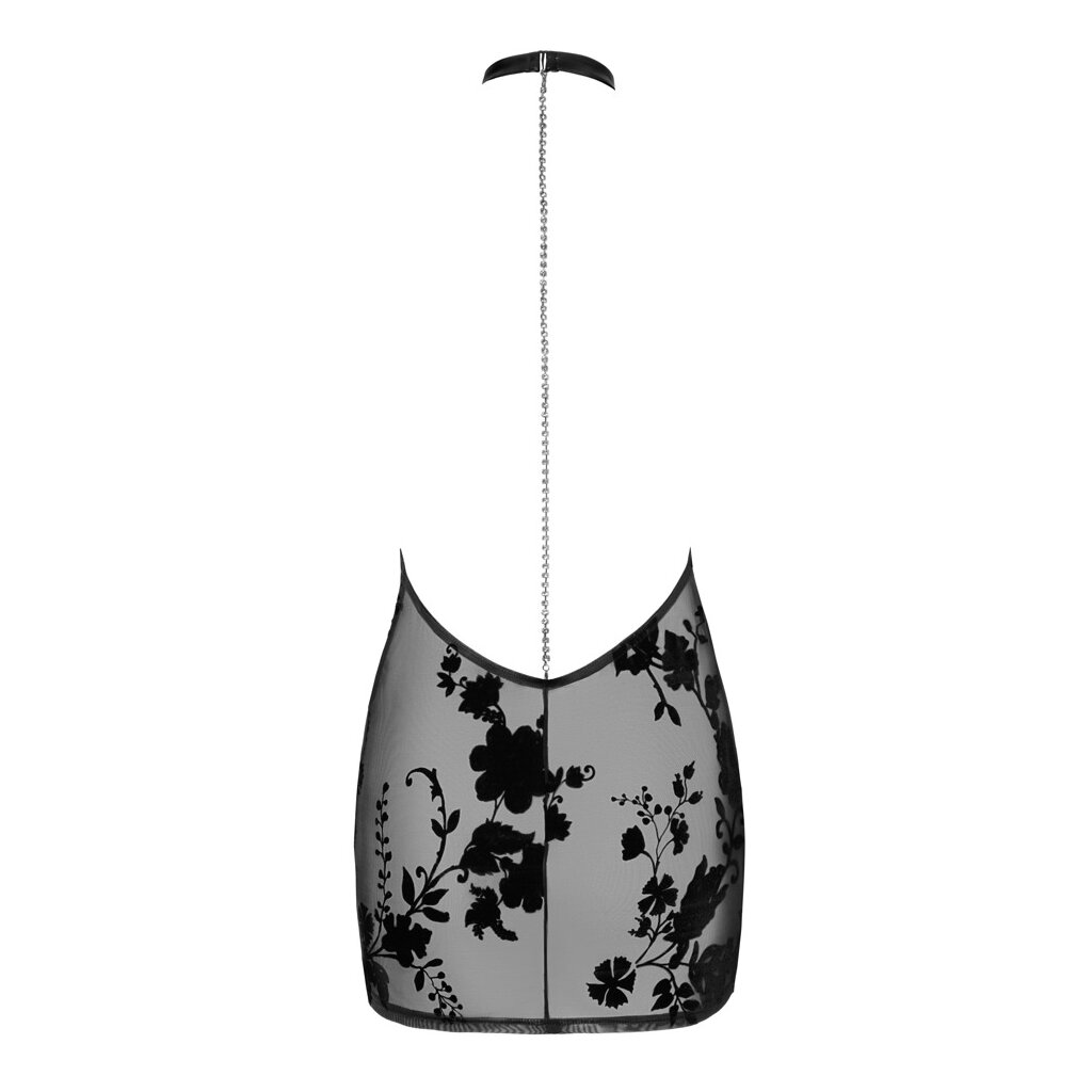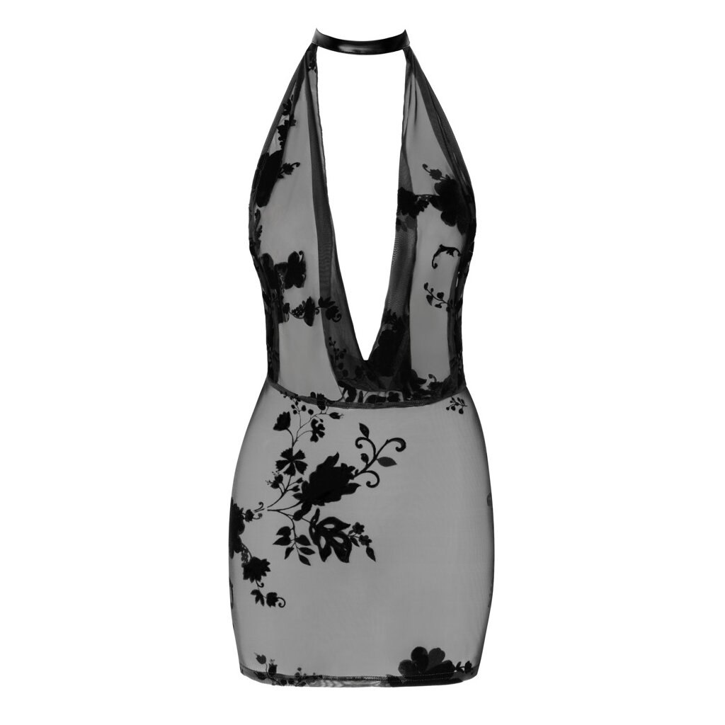 Black transparent mini dress from Noir made entirely from fine stretch tulle with a floral velvet flock print. Soft and stretchy all over for a perfect fit and high wearing comfort. In an excitingly tight cut with a halterneck and extra-deep waterfall neckline. With a rhinestone-studded long chain down to the bottom at the open back.