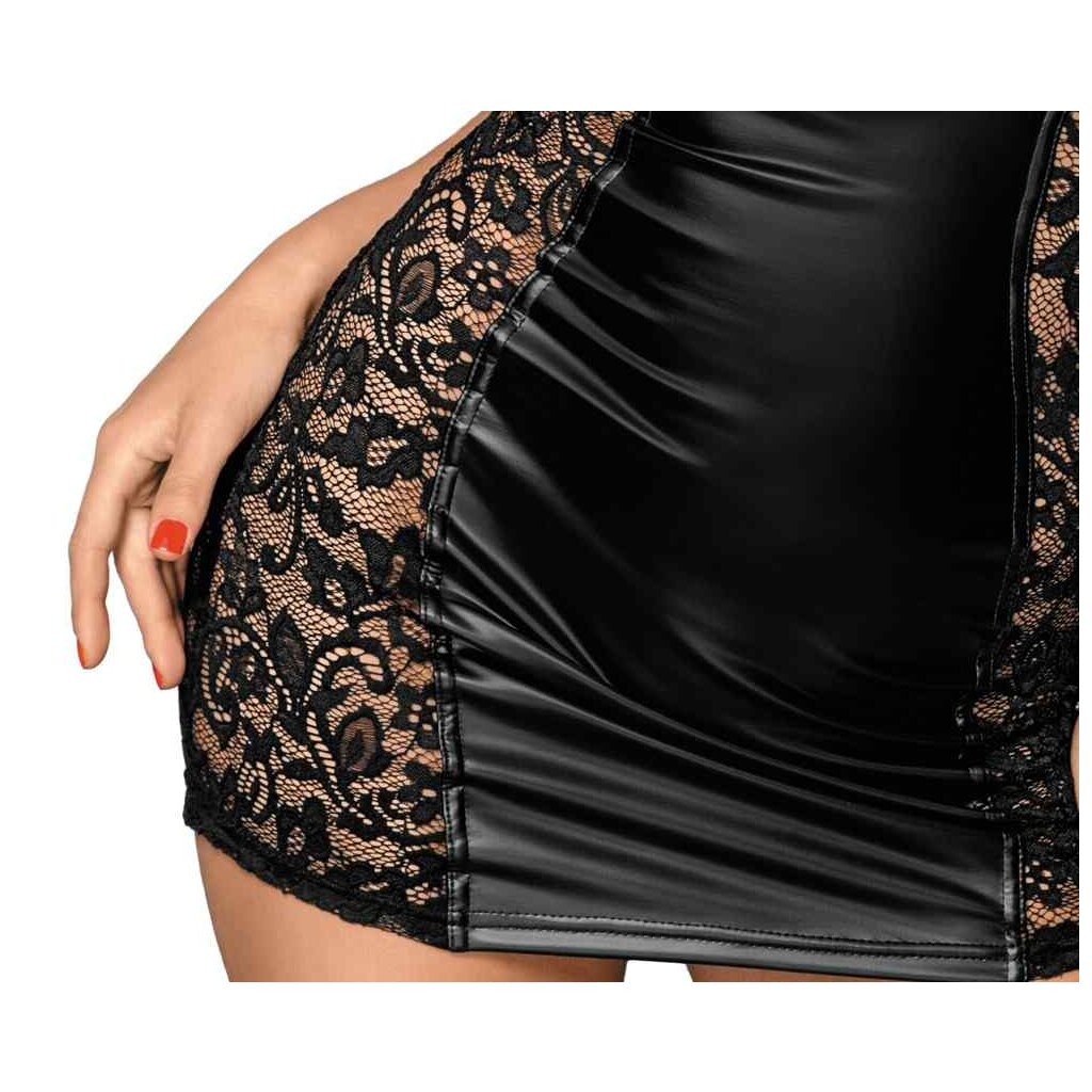 Small, short, black! Tight-fitting dress that is fitted at the waist. It is made out of shiny, black, matte power wet look and has a wide lace insert at either side. It is low cut at the front and the back. It also has thin straps.