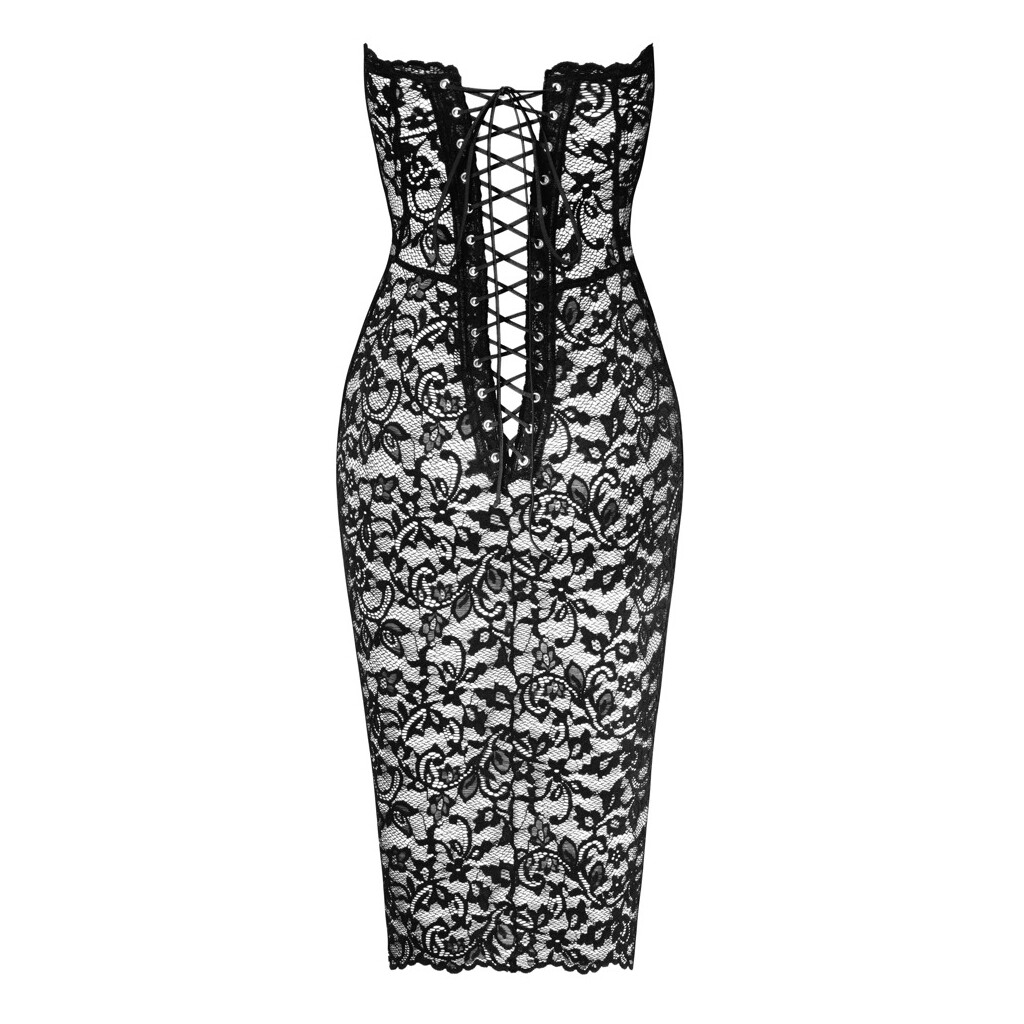 Schulterfreies, schwarzes Schlauchkleid von Noir in knielanger Länge. Aus wunderschöner floraler Spitze allover - weich und dehnbar für hohen Tragekomfort. In taillierter Korsettform mit akzentuierenden Nähten im Vorderteil. Mit offener Schnürung im Rücken bis zum Po, die je nach Passform gebunden werden kann.