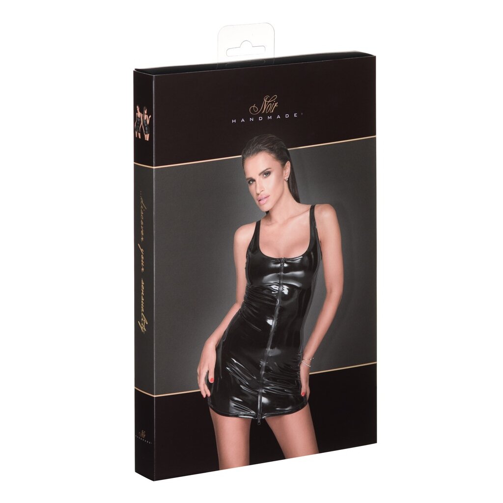 Robe courte de Noir en vinyle noir brillant. Coupe moulante avec un beau décolleté plongeant sur le devant et dans le dos. Fermeture à glissière double sens sur toute la longueur du devant qui peut s'ouvrir en haut et en bas.