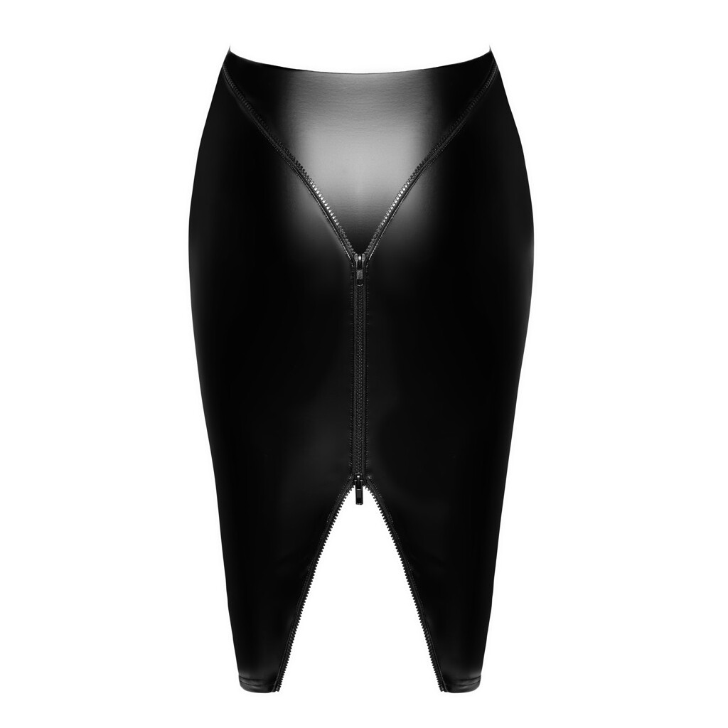 Knieumspielender, figurbetonender Rock von Noir. Im trendigen schwarzen Powerwetlook mit raffiniertem 2-Wege-Reißverschluss hinten – dekorativ und sexy. Rundum weich und elastisch für hohen Tragekomfort.