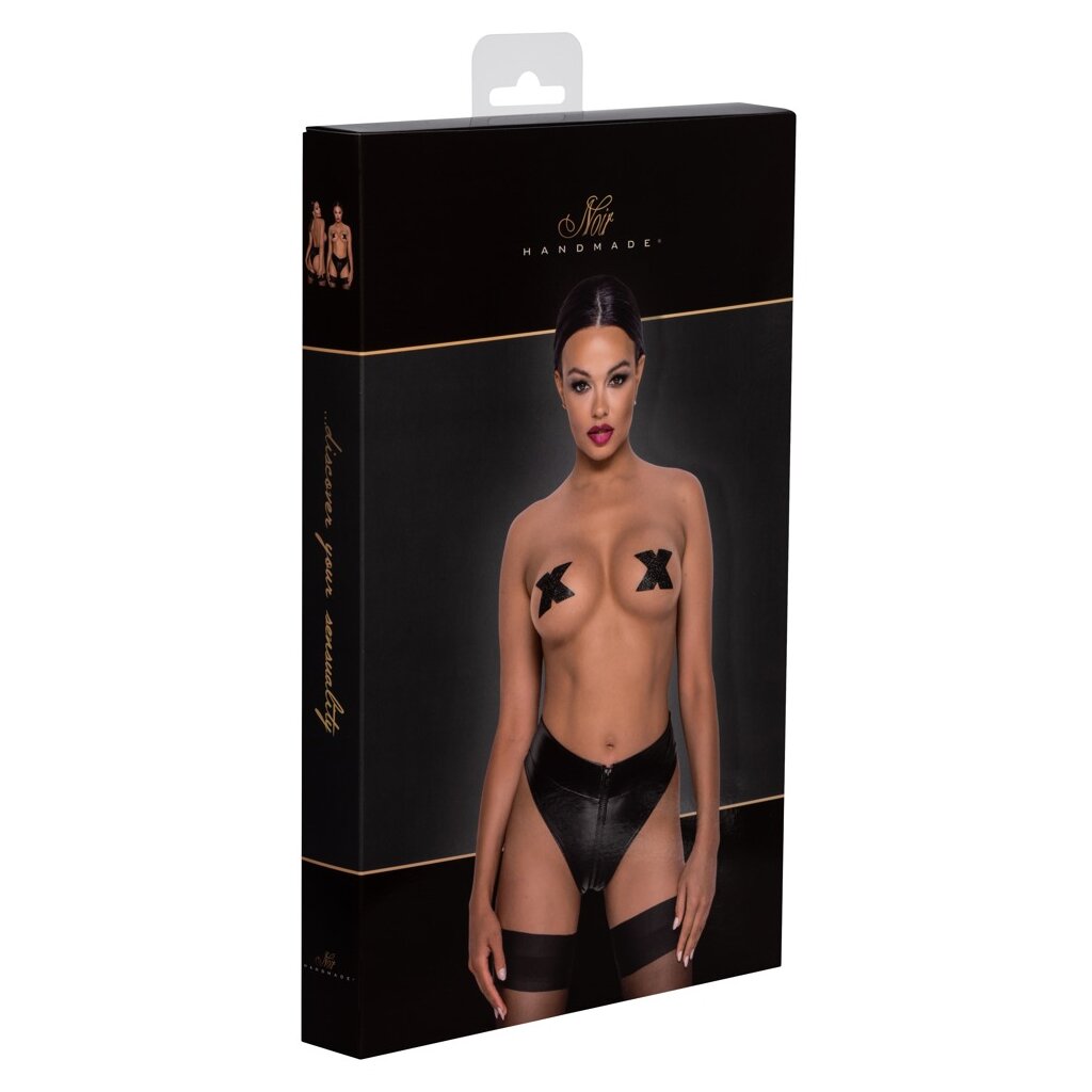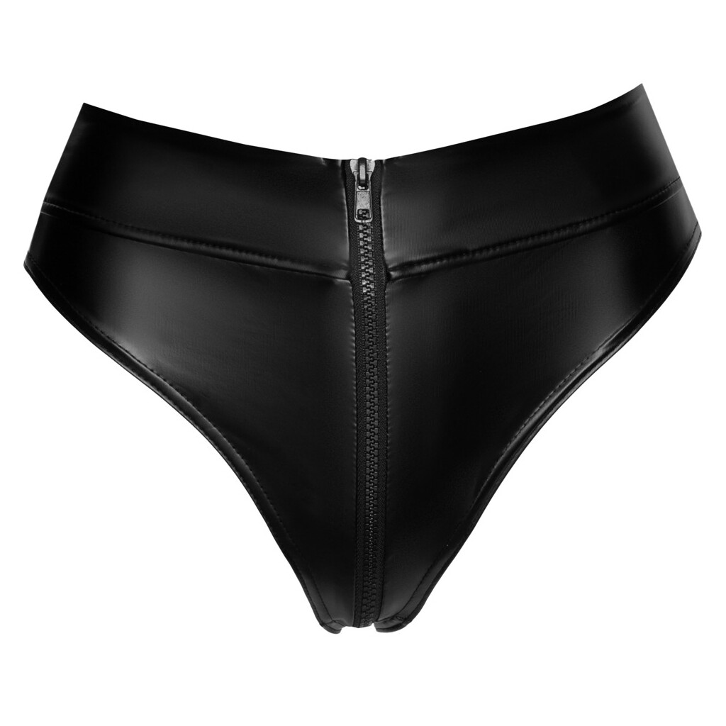 Taillenhoch geschnittener, rundum elastischer Slip von Noir in schwarzem edlen Powerwetlook. Mit durchgehendem 2-Wege-Reißverschluss vom breit abgesetzten Bund durch den Schritt bis über das Gesäß. Extra hohe Beinausschnitte setzen Gesäß und Beine aufregend in Szene.