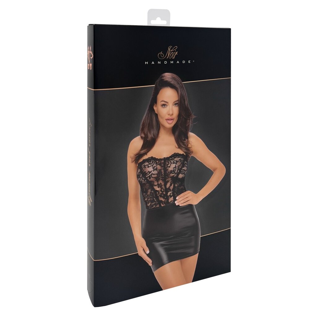 Schwarzes, schulterfreies Röhren-Minikleid von Noir in einem raffinierten Materialmix aus feiner Spitze (Oberteil) und glänzend-mattem Powerwetlook (Rock). Rundum weich und dehnbar für einen hohen Tragekomfort. In taillierter Korsettform mit akzentuierenden Nähten im Vorderteil. Mit offener Schnürung im Rücken bis zum Po, die je nach Passform gebunden werden kann.