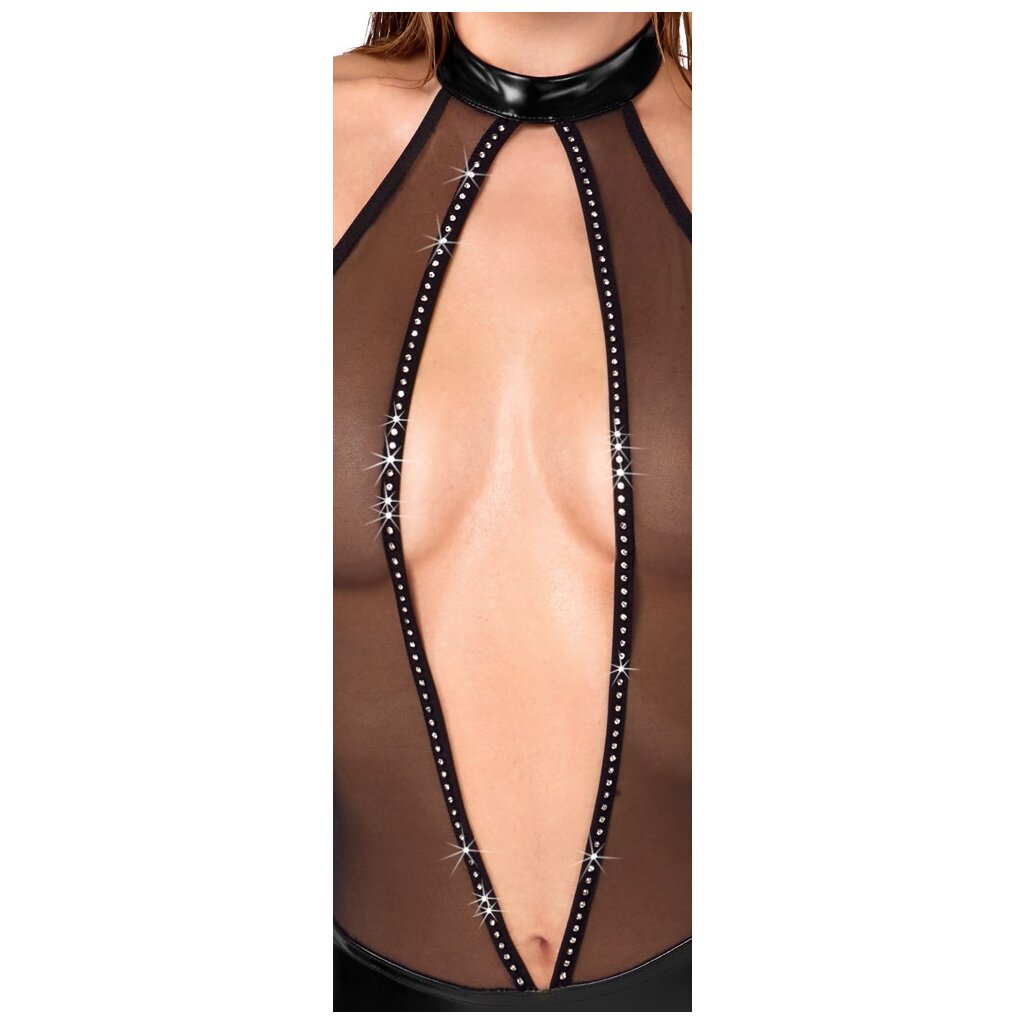 Exclusive Noir string body in a modern material mix of shiny power wetlook and delicate mesh. The daring shoulderless, backless design features a stand-up neckholder fastened at the nape.