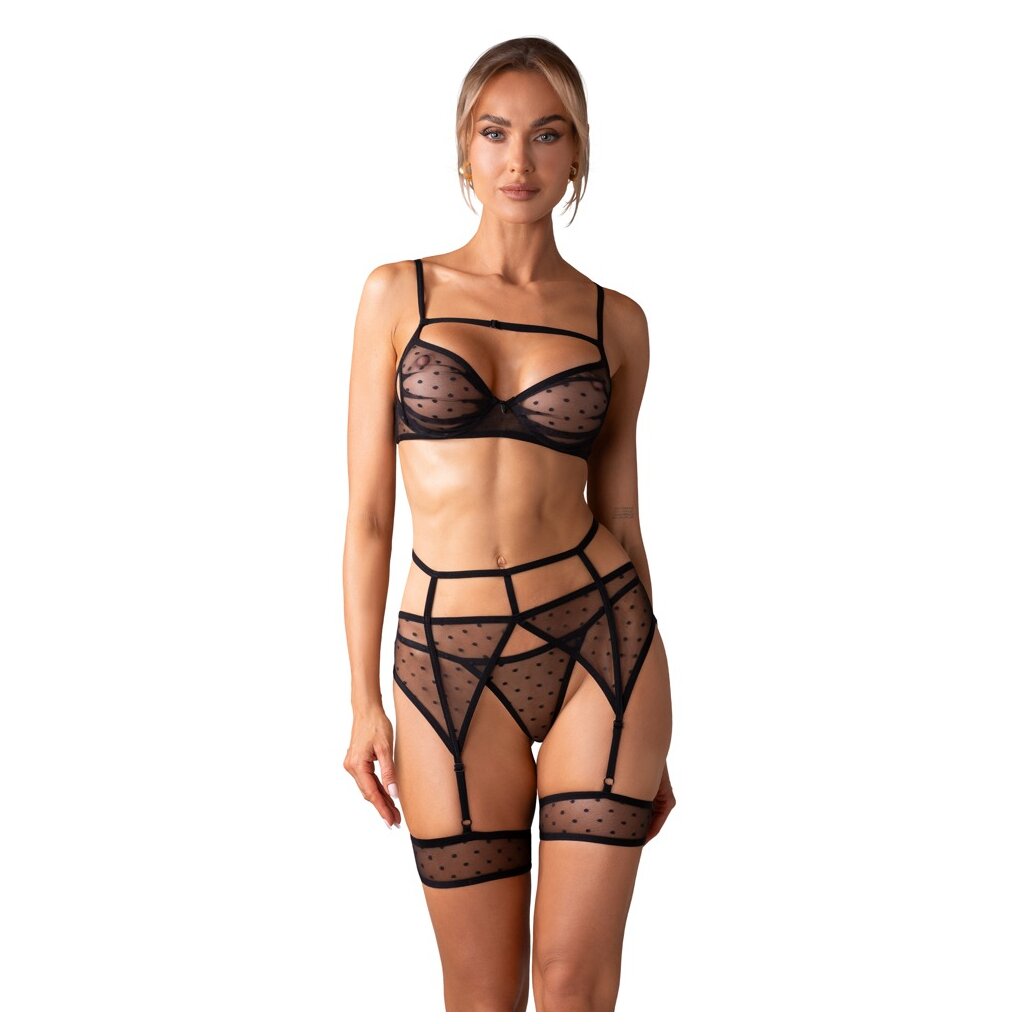 Ensemble 3 pièces Nuites by Obsessive comprenant un soutien-gorge, un porte-jarretelles avec jarretelles et un string. Un style séduisant dans une transparence noire chic avec des points élégants et des détails de bretelles à la mode. Doux et extensible sur toute la surface pour un grand confort. Soutien-gorge avec décolleté réglable et détails décoratifs subtils entre les bonnets souples. Les bretelles et la fermeture à crochet au dos peuvent être ajustées. Porte-jarretelles avec fermeture à crochet au dos. Les bretelles avec jarretelles élastiques sont réglables en longueur.