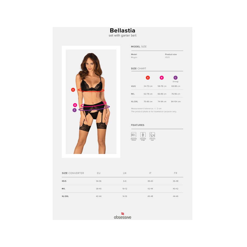 3-teiliges, schwarzes Bellastia-Set von Obsessive mit Bügel-BH, Strapsgürtel und Tanga. Weiches Stretch-Material und weiche elastische florale Spitze im verführerischen Mix. BH mit dekorativem Element zwischen den Bügel-Cups und verstellbarem Hakenverschluss am Rücken. Die mit Spitze besetzten Träger am Rücken und die Strapshalter können ebenfalls verstellt werden.