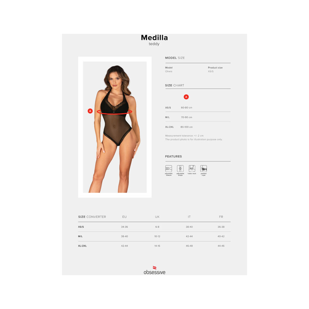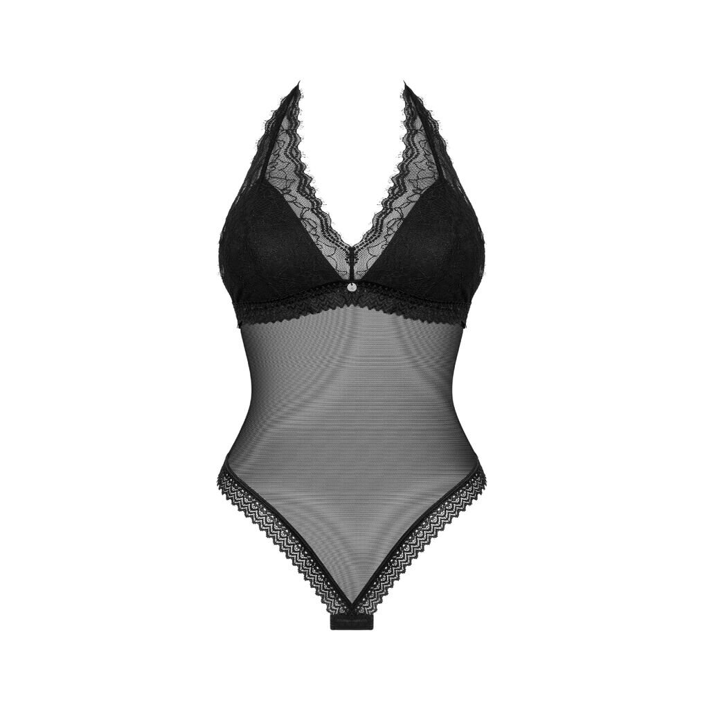 Black transparent, tight-fitting Medilla thong body by Obsessive with opaque underlay cups. Fine material mix with fine eyelash lace. Soft and elastic all over for complete comfort. The fashionable halterneck is adjustable, as is the hook fastener at the back. With a small decorative element between the cups.