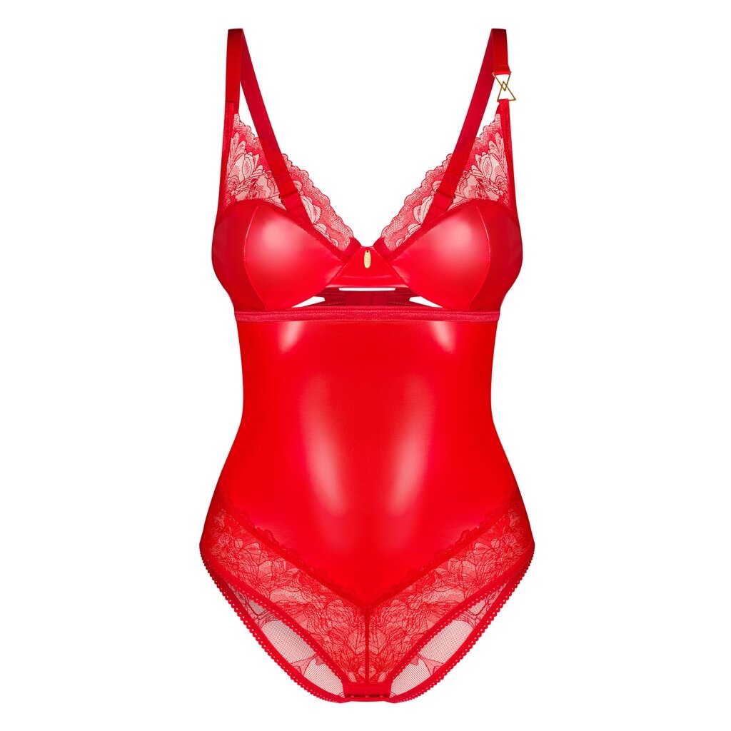 Aliosa Bodysuit von Obsessive im verführerischen Stil. In sinnlichem Rot mit elegantem, glattem Glanz und feiner, transparenter, floraler Spitze. Weich und dehnbar am ganzen Körper für hohen Tragekomfort. Mit dezenter goldfarbener Verzierung zwischen den Bügel-Cups und an einem Träger. Der Hakenverschluss im Schritt sowie die Träger und der Hakenverschluss im Rücken sind verstellbar.
