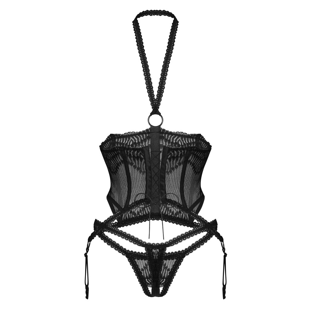 Le bustier Alliane d'Obsessive comprend un string ouvert. Dans une transparence noire sensuelle avec un décolleté tendance. Élastiqué tout autour, doux et souple. Les jarretelles latérales sophistiquées et la fermeture à crochets dans le dos ouvert sont réglables. Le string ouvert séduisant complète ce duo ouvert excitant.