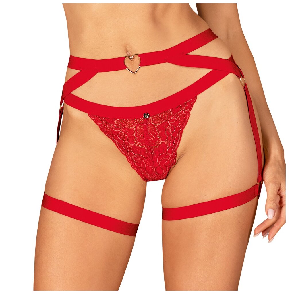 Red Elianes harness by Obsessive made from wide, soft stretch straps with gold-colored ring details.