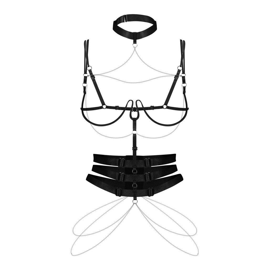 Stylishly daring Premisis harness from Obsessive Premium in a unique design with high-quality materials and handmade workmanship. The black one-piece consists of a collar, a bra, and a 3-strap waist belt. Everything is connected and elaborately decorated with silver-colored chains.