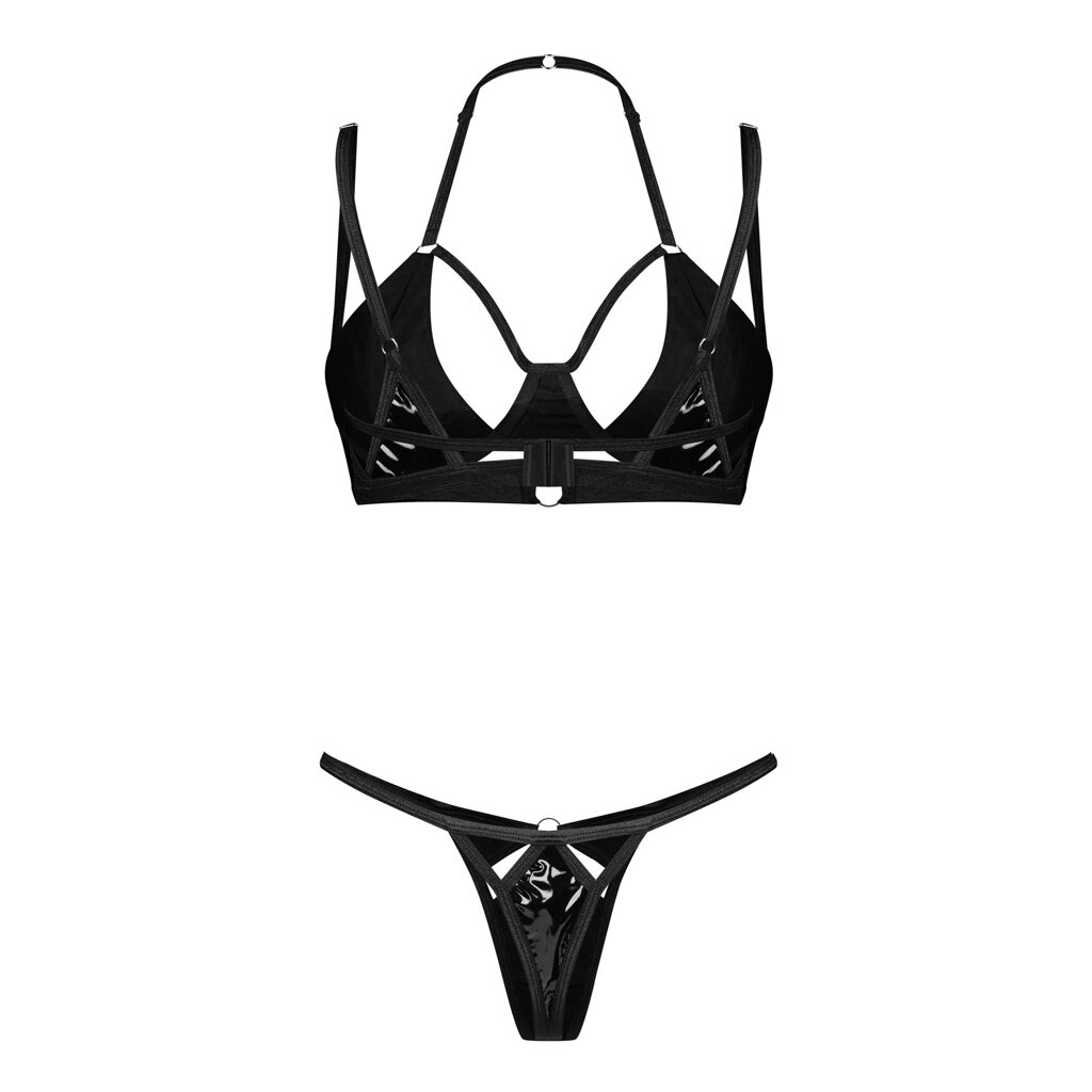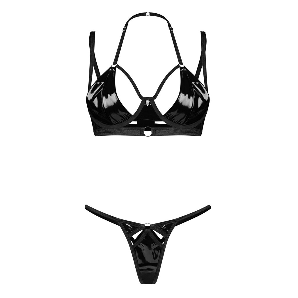 L’ensemble Keira Lise en vinyle séduit par son éclat noir profond et son style sensuellement travaillé. Le soutien-gorge brillant présente des lanières extensibles et des découpes audacieuses qui mettent les courbes en valeur tout en créant un jeu fascinant entre lumière et silhouette. Un petit bijou argenté entre les bonnets apporte une touche élégante et sophistiquée.