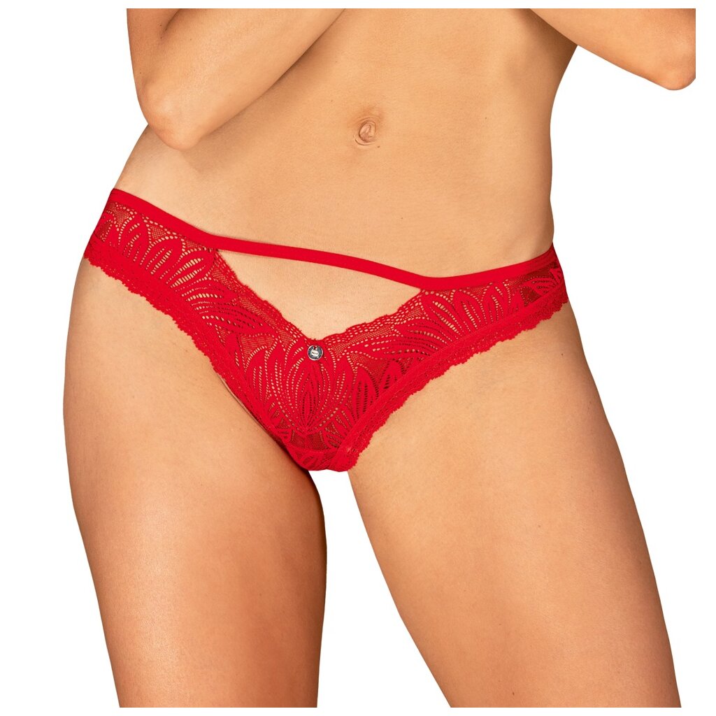 La fine culotte Chilisa d'Obsessive est entièrement réalisée en dentelle florale délicate et encadre parfaitement les courbes féminines. Elle présente une découpe sophistiquée sur le devant, associée à un ruban délicat qui attire le regard vers l'entrejambe. Le détail du cœur scintillant au bas de la robe attire tous les regards.