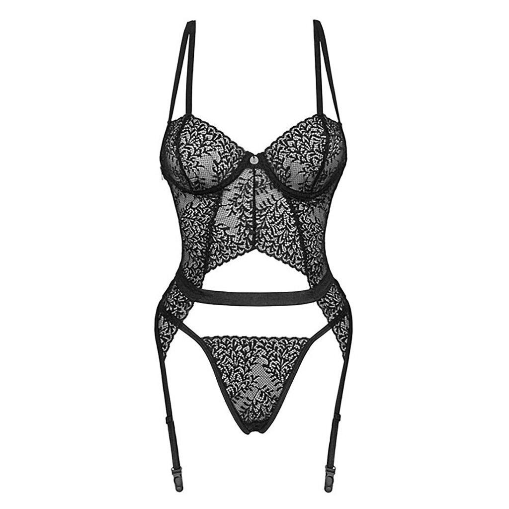 Suspender shirt and thong in the set Yaskana by Obsessive made of fine lace. Soft and elastic for maximum wearing comfort. In refined belly cut with waist band. Cups worked on underwire for perfect support and fit. Exciting back view with variable lacing. The straps and suspenders are adjustable to fit. The simple beautiful lace thong completes this seductive look.