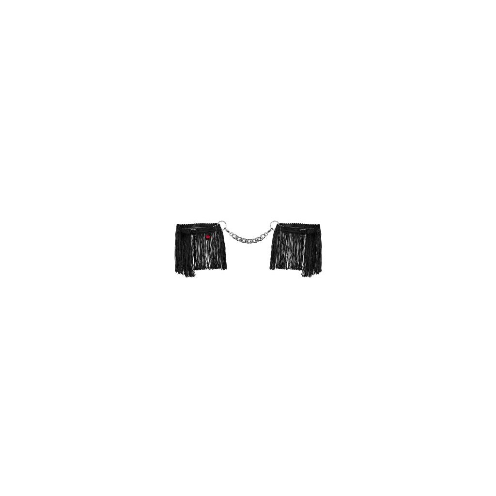 Accessoire captivant ! Menottes noires extravagantes Sherila d'Obsessive dans un look à franges. Deux bracelets stretch confortables et réglables sont garnis tout autour de franges douces et brillantes. La courte chaîne de liaison argentée s'accroche et se décroche facilement des anneaux des liens à l'aide de petits mousquetons. Composition : 44% polyamide, 56% élasthanne