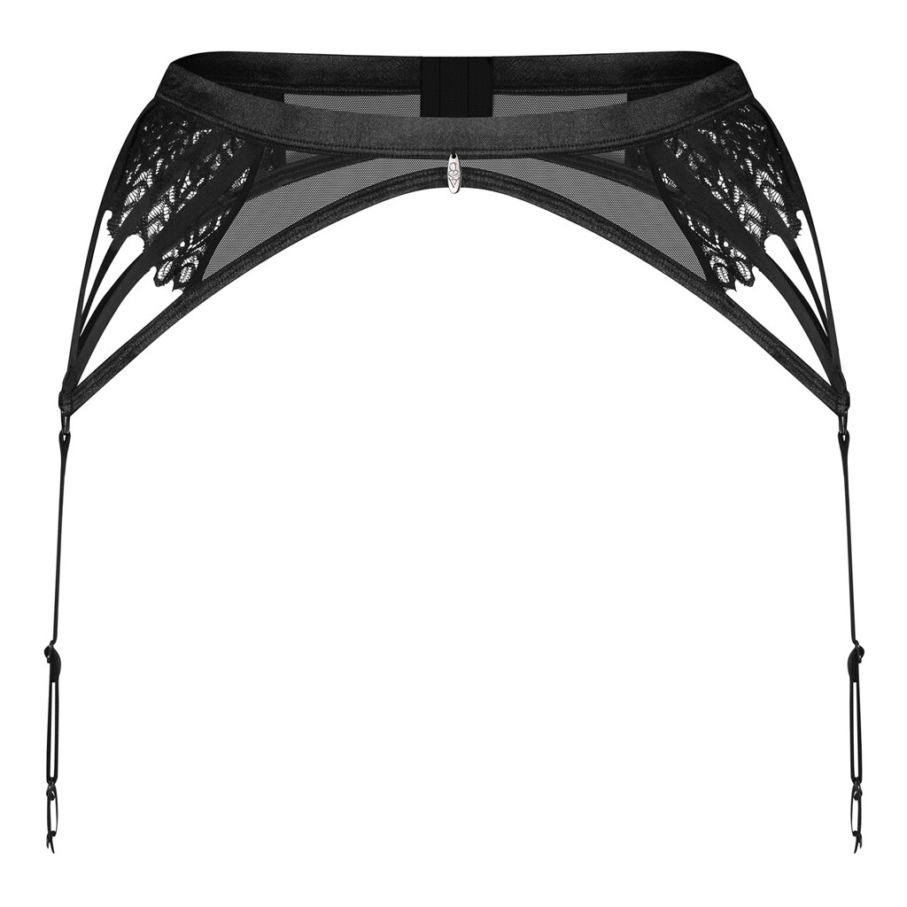 Black transparent suspender belt Donarella by Obsessive with elaborate embroidery inserts on the sides. Soft and elastic for high wearing comfort. 4 stretch straps join together at the sides to form an adjustable suspender belt. With hook fastener at the back. Small decorative element at the front of the waistband.