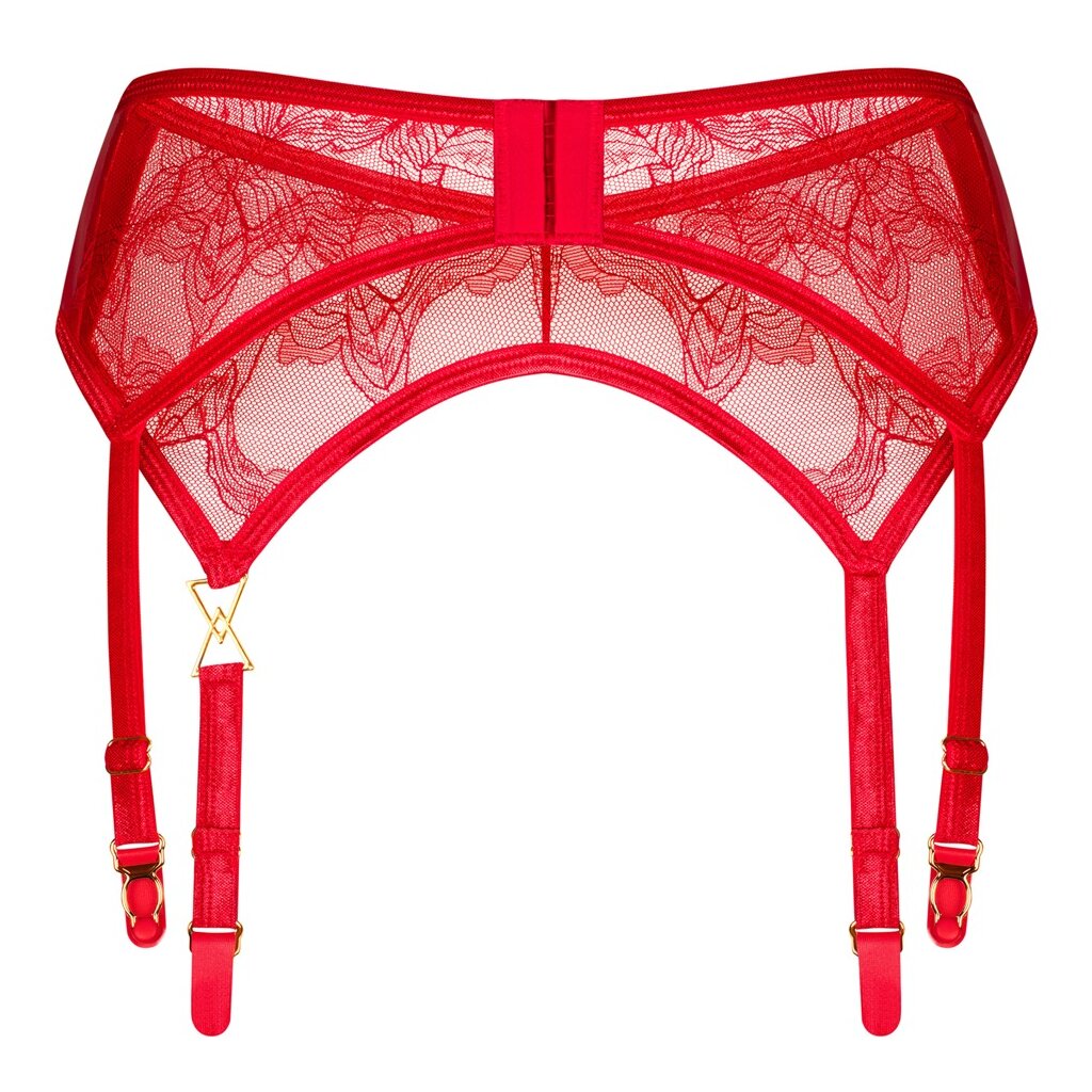 Magnifique porte-jarretelles Aliosa by Obsessive en rouge sensuel, en dentelle florale douce et extensible. Avec des éléments décoratifs dorés sur la ceinture et sur un porte-jarretelles. Les bretelles et la fermeture à crochet au dos peuvent être ajustées pour un ajustement parfait.