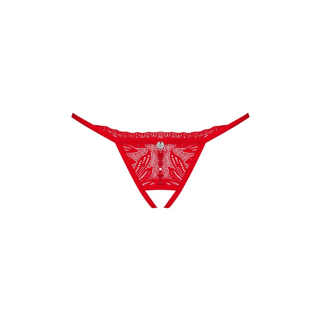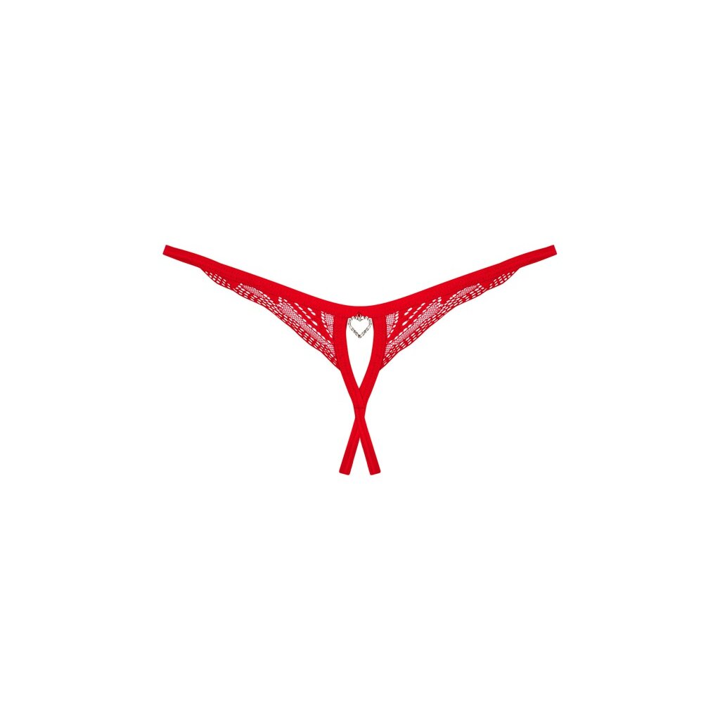 Der zarte Tanga Chilisa von Obsessive ist aus feiner floraler Spitze gefertigt und hat einen einladend offenen Schritt. Über dem Po befindet sich ein raffinierter Ausschnitt mit einem filigranen Herz-Anhänger.