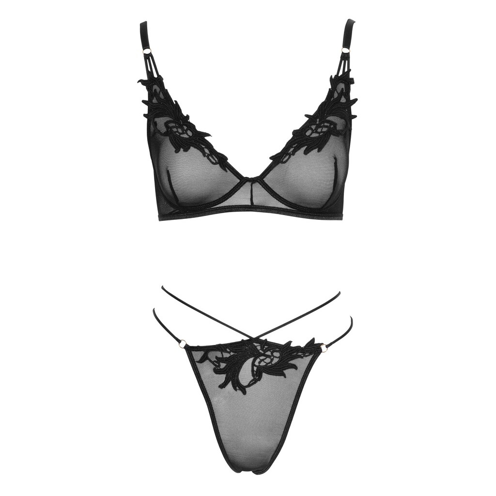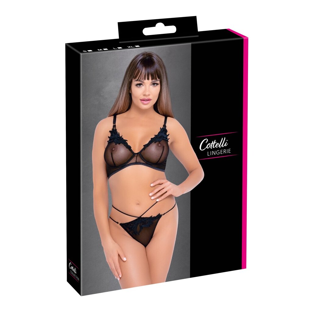 BH und Riostring von Cottelli LINGERIE aus elastischem Powernet mit edlen Stickerei-Applikationen an den Cups und an der Stringfront, sowie goldfarbenen Ring-Details. BH mit verstellbaren Trägern und Hakenverschluss im Rücken. Riostring mit doppeltem Stretchband-Bund.