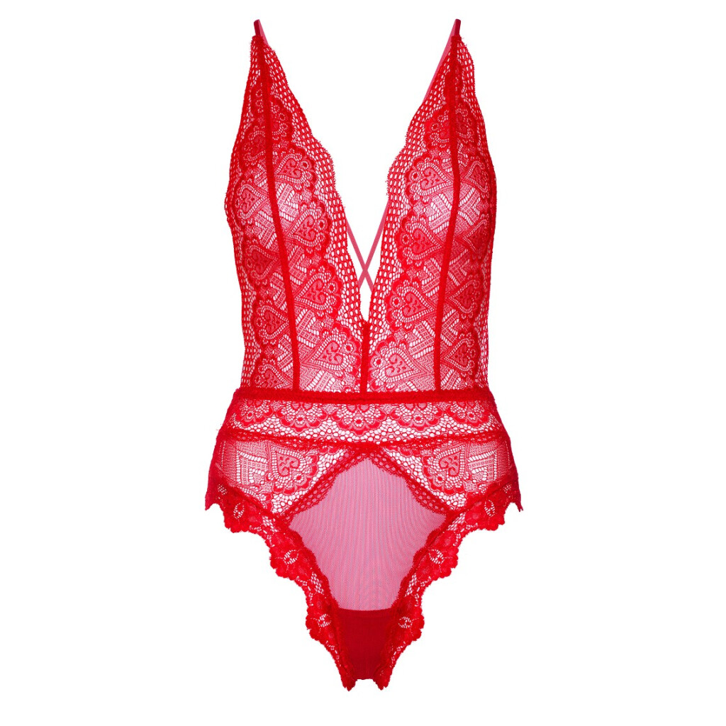 • Deep-V Lace Teddy - Tief ausgeschnittener Teddy aus zarter Spitze mit Herzmotiv und durchsichtigem Netz.