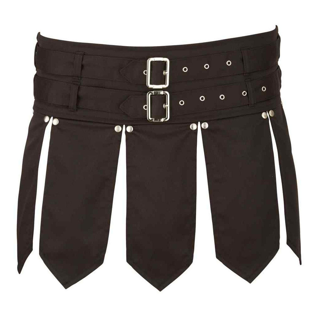 Schwarzer Rock im Gladiator-Style mit zwei Gürteln. Hinten Stretch. 60% Polyester, 35% Baumwolle, 5% Elasthan.