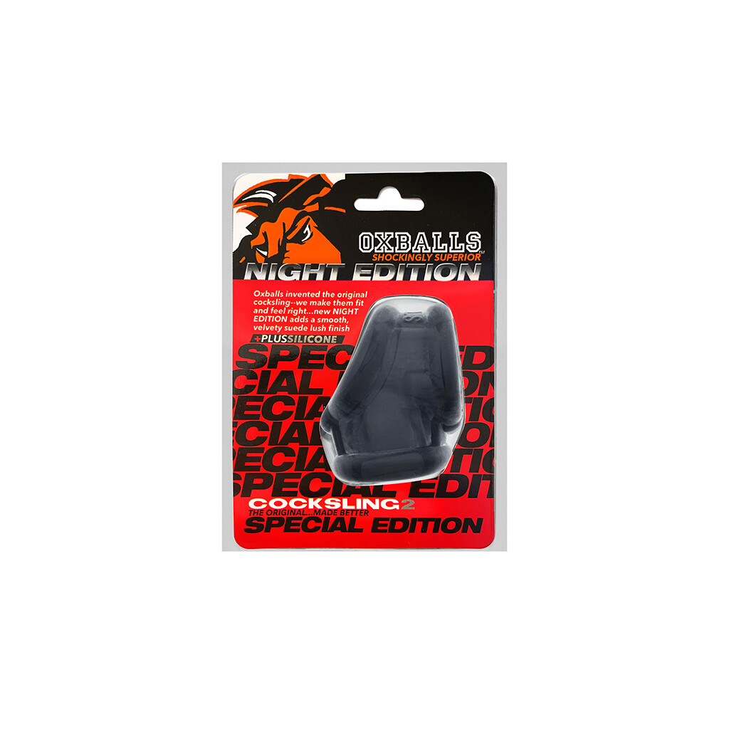 COCKSLING-2 cock + ball sling in new NIGHT EDITION…velvety silicone finish PLUS+silicone™ blend, TPR for amazing stretch + silicone for a rubbery warm feel. NIGHT BLACK color is a deep dull-finish black that feels warm and silky-smooth, less grippy, it glides on…more like vintage black rubber it looks rich and deep and feels super slick.