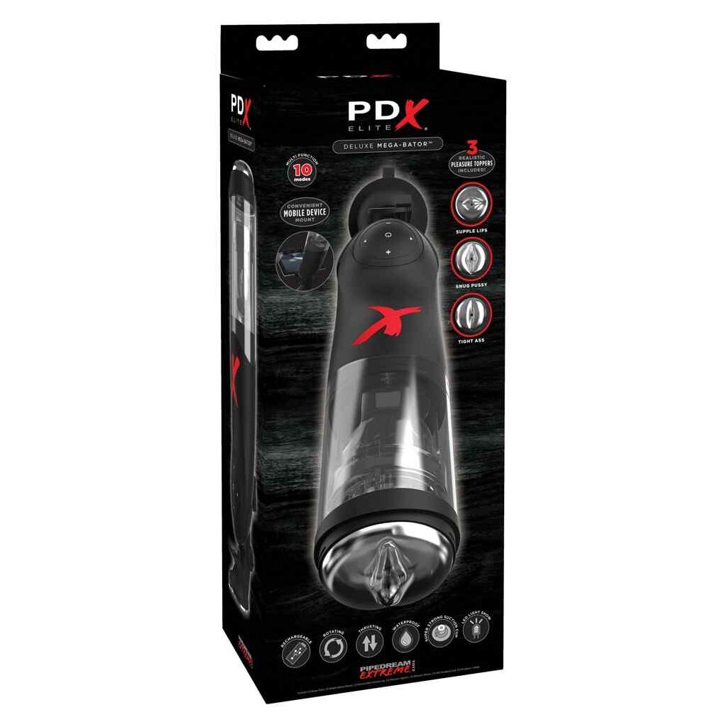 This individually customisable masturbator offers 3 different pleasure openings – an extremely realistic vagina, supple lips or a tight anus, this one's got it all. The 10 rotation and thrusting modes will grant the user sweet ecstasy and those who like it faster can adjust the 5 speeds separately from the other functions. This pleasure-giver can be fixed to any smooth surface thanks to the suction cup to allow a hands-free use. The Deluxe Mega-Bator can also be used in the shower because it's waterproof. A special highlight is the mobile device holder that can hold a tablet or a smartphone. Includes a USB cable and 3 cock rings.