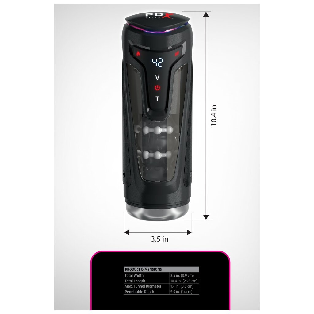 Masturbateur Moto-Bator Pro de PDX Elite dans un étui pratique et discret. Il dorlote le pénis sur toute sa surface grâce à de puissantes vibrations et à un massage intensif de la poussée à l'aide de 3 anneaux en forme de perles. La fonction de chauffage (2 modes) peut être activée par simple pression d'un bouton pour porter rapidement le masturbateur à la bonne température corporelle et d'utilisation.