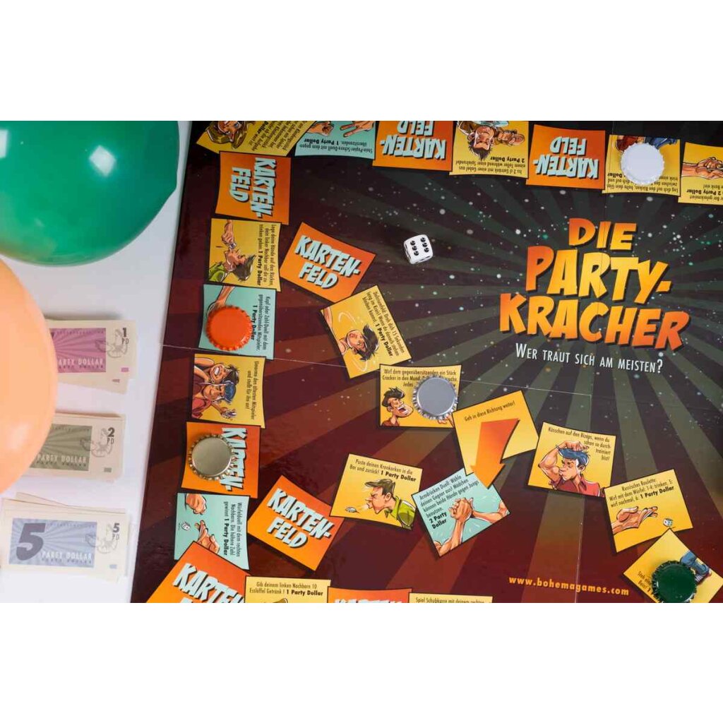 Party Cracker est un jeu de société exaltant pour les amis. Lancez les dés, déplacez les bouchons de couronne sur les cases, tirez des cartes de tâches drôles ou même épicées et effectuez les tâches. Chantez, dansez, devinez, faites des duels, jouez la comédie, déshabillez-vous, alors amusez-vous !