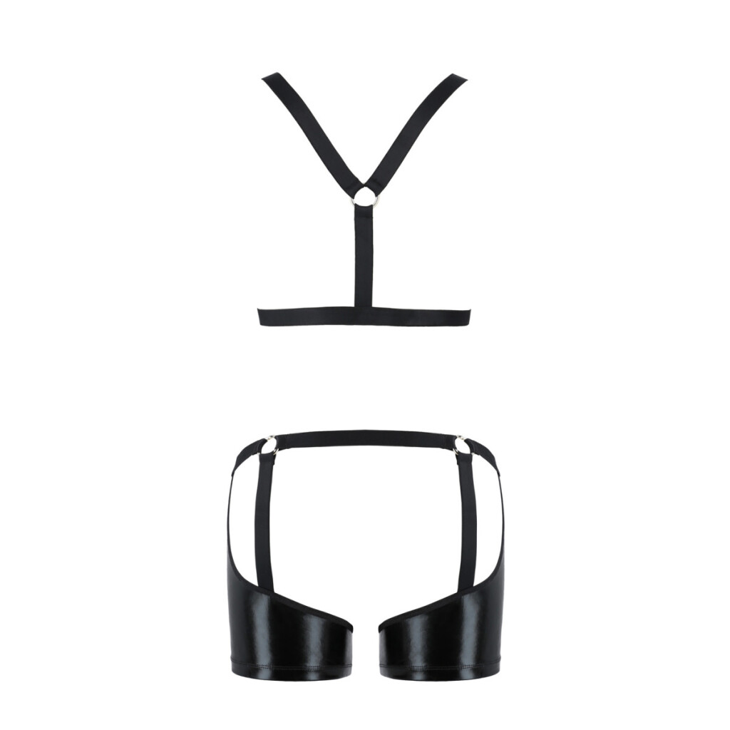 - Les sous-vêtements sont composés d'une matière noire et brillante combinée à des anneaux métalliques décoratifs
