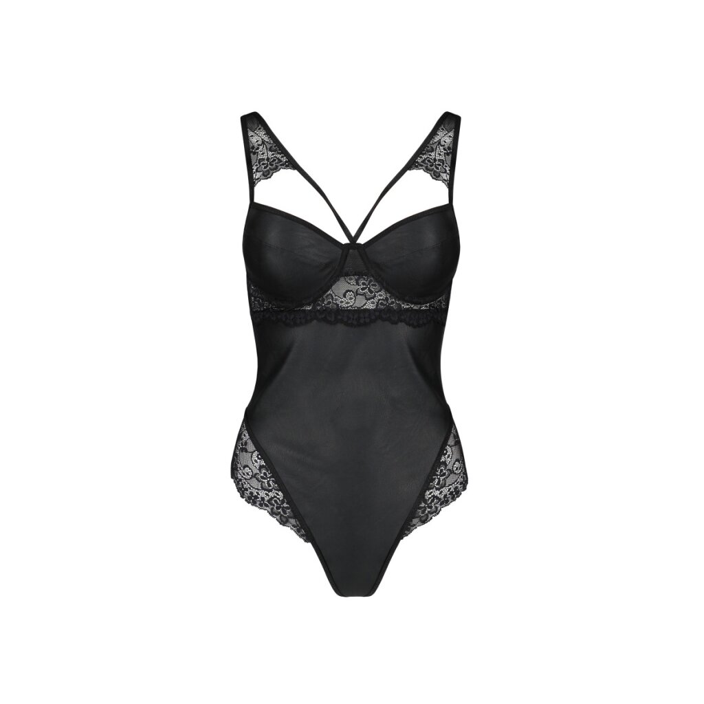• Sexy string body fait d'un mélange de dentelle florale délicate ainsi que de matériel ressemblant à du cuir