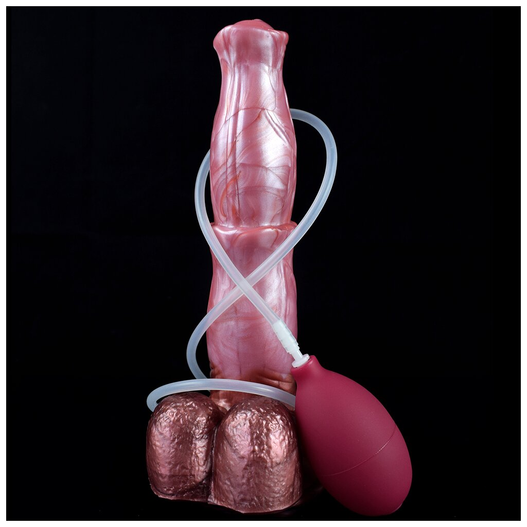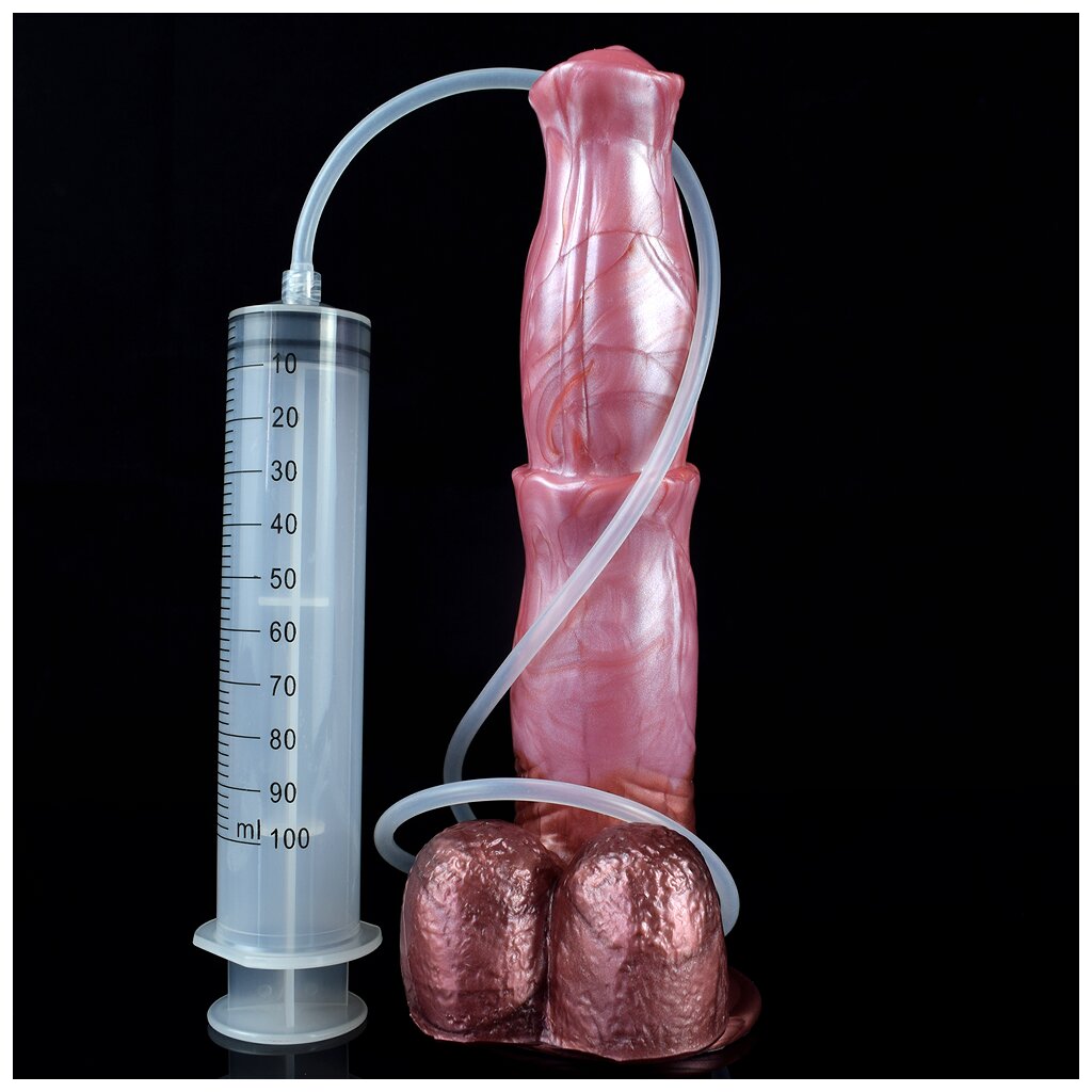 Der Dildo ist von innen hohl, sodass er mit einer beliebigen Flüssigkeit gefüllt werden kann. Das Kunstsperma gelangt über einen Schlauch in den Dildo hinein und kann anschließend wieder hinausgespritzt werden. Über einen Pumpball oder Spritze wird der Saft in Dir oder wohin auch immer Du willst verspritzt.