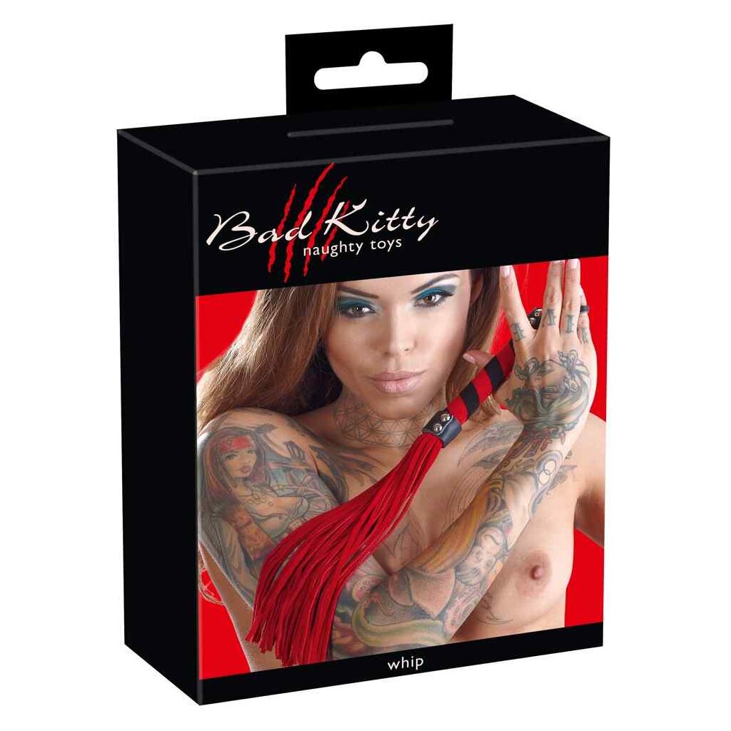 For bittersweet strokes! Small red/black flogger with soft velour tails and a handle that is covered in material. The material is in two different colours. Length 38 cm. Textile (microfibre): 50% polyamide, 50% polyurethane.
