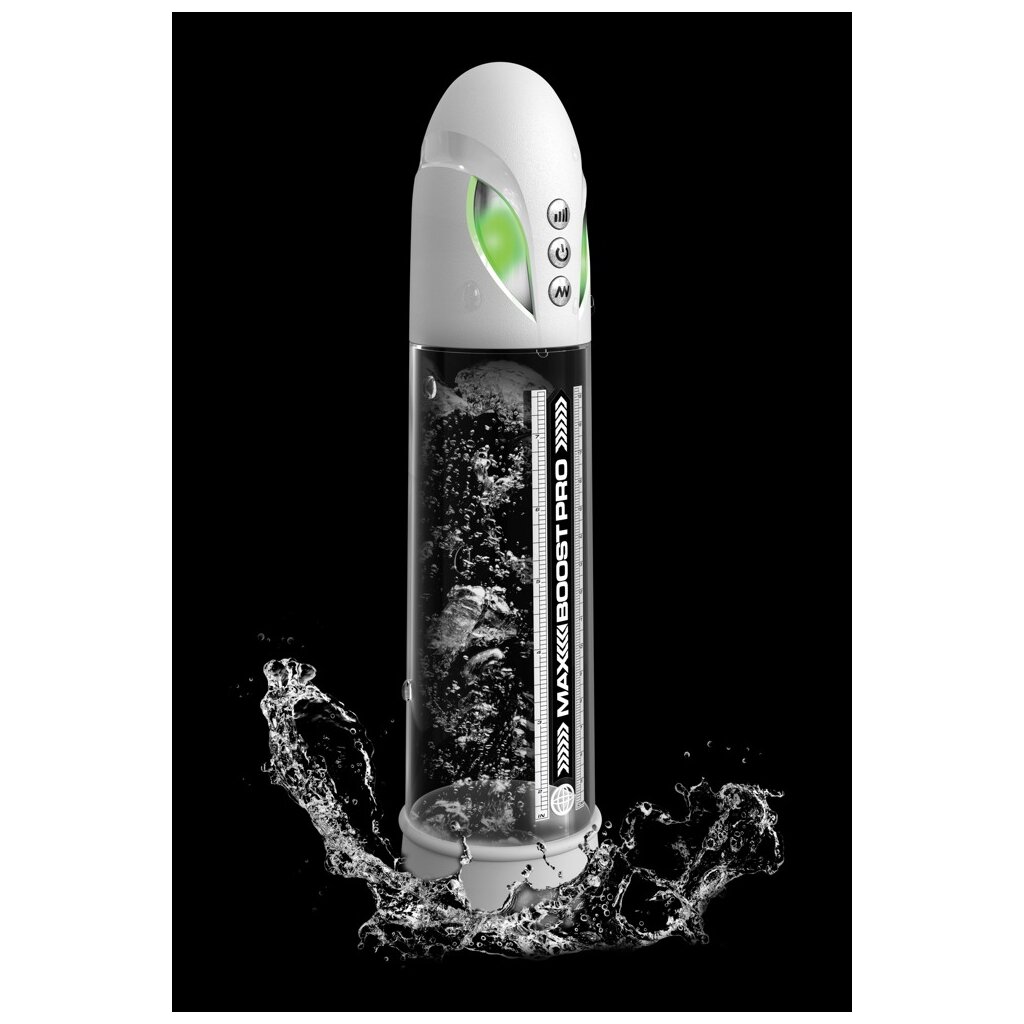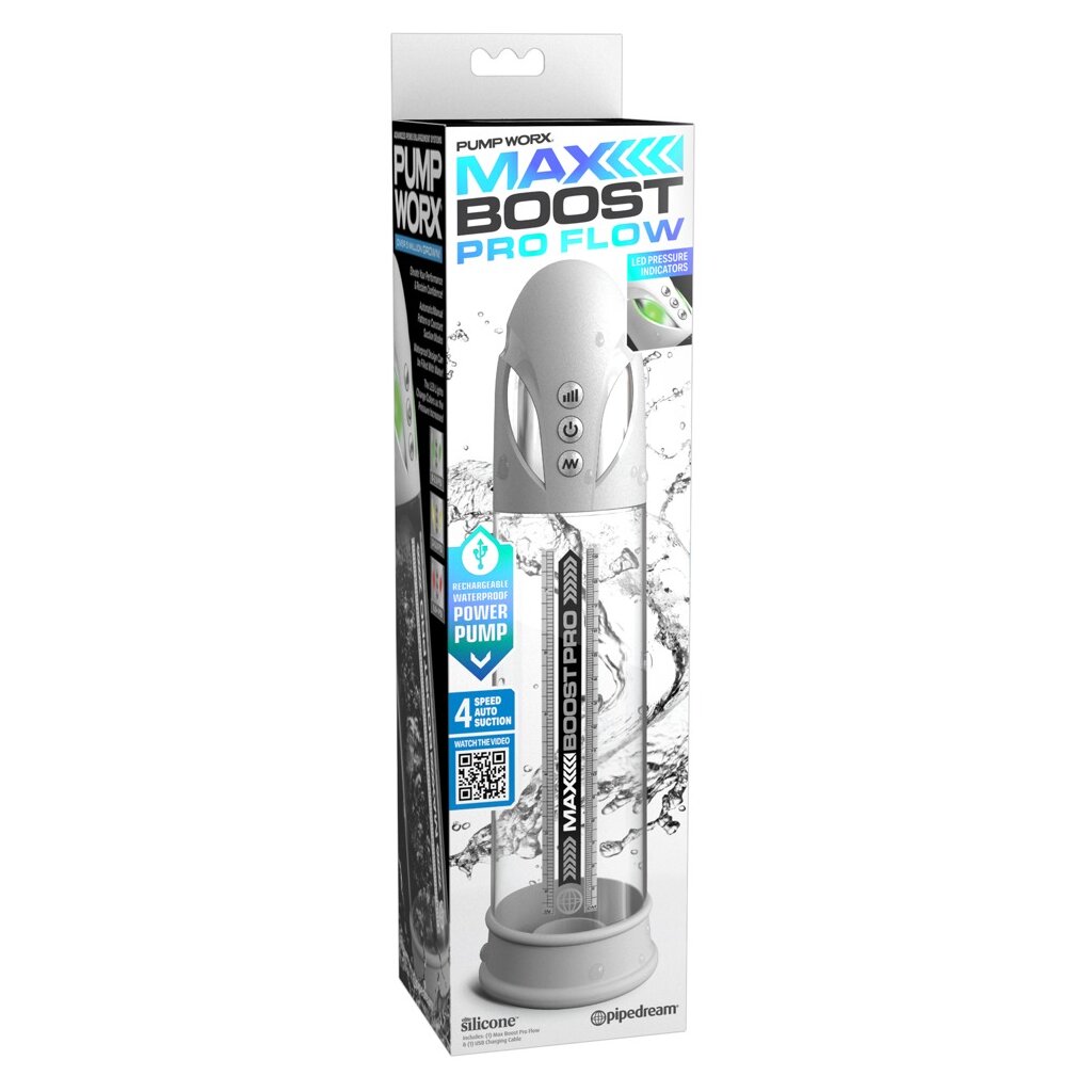 Transparente Penispumpe Max Boost Pro Flow von Pump Worx für alle Männer, die sich ein effektives Training für den Penis wünschen. Mit starker Saugkraft bequem per Knopfdruck – stimulierend wie beim besten Blowjob. Einfach zurücklehnen und genießen! Entspanntes Vergnügen zur Verbesserung von Erektionsstärke und -härte für lang andauernde Leistung.